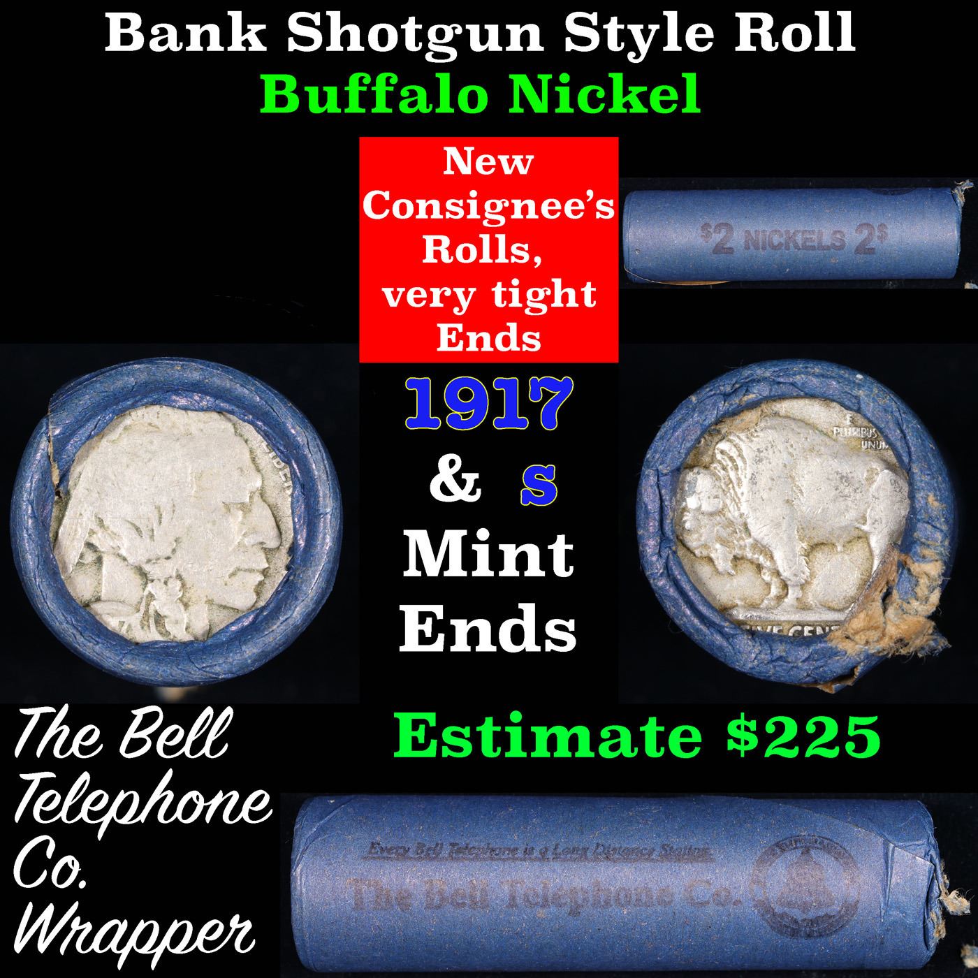 Buffalo Nickel Shotgun Roll in Old Bank Style 'Bell Telephone' Wrapper 1917 & S Mint Ends. The roll is held in an old, rare "Bell Telephone Co." Bank style wrapper. This is the Bell Telephone logo from the 1960's. They are all frrom one Estate. The ends on these rolls are very tight. We will guarantee they are all full dates.