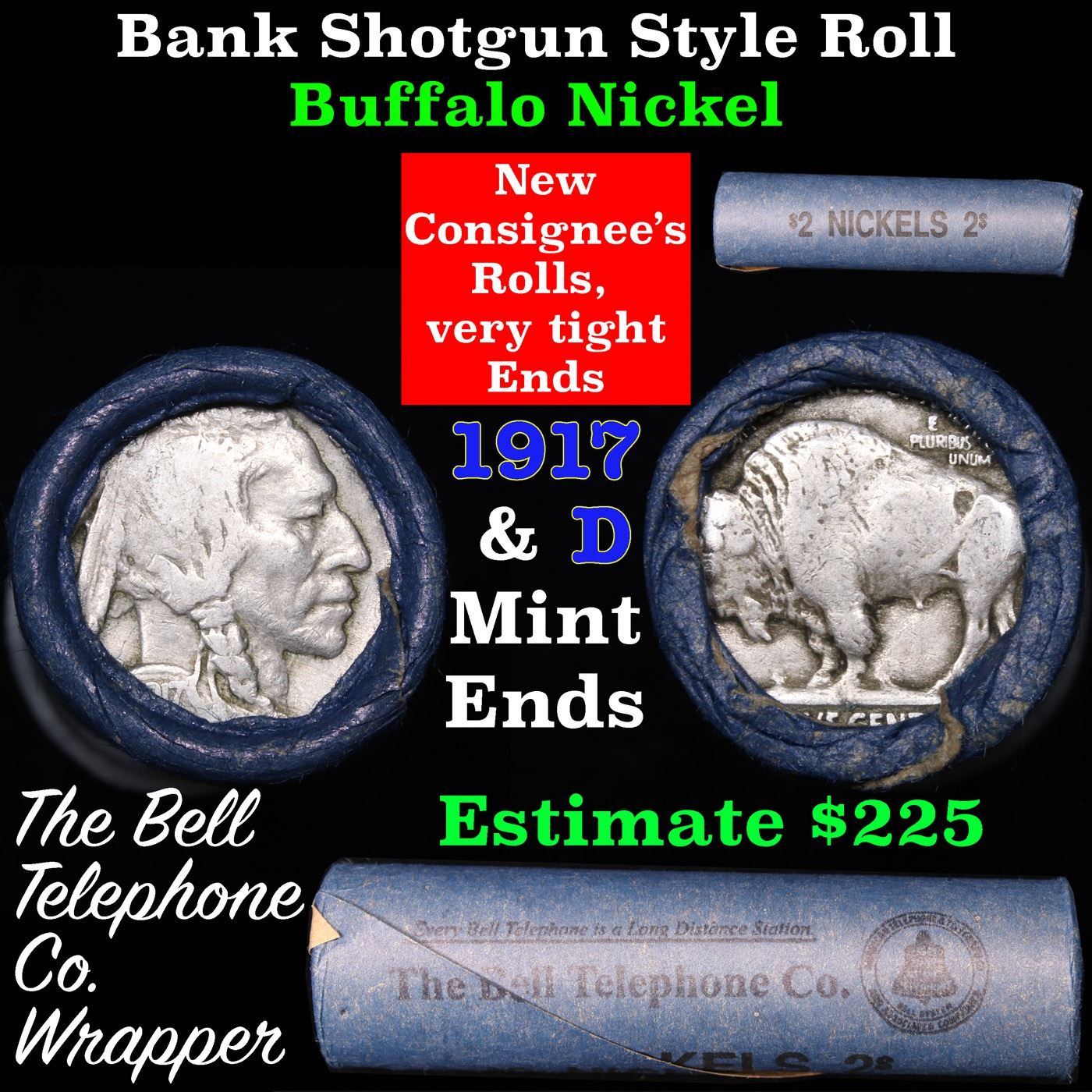 Buffalo Nickel Shotgun Roll in Old Bank Style 'Bell Telephone' Wrapper 1917 & d Mint Ends Grades. The roll is held in an old, rare "Bell Telephone Co." Bank style wrapper. This is the Bell Telephone logo from the 1960's. They are all frrom one Estate. The ends on these rolls are very tight. We will guarantee they are all full dates.