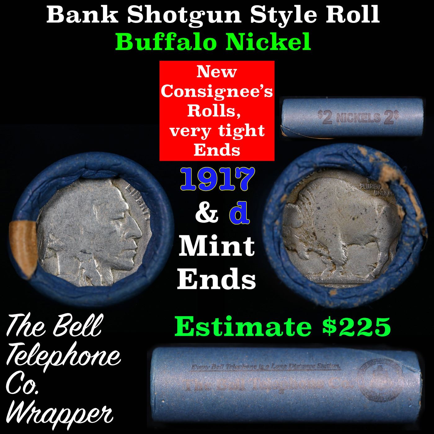 Buffalo Nickel Shotgun Roll in Old Bank Style 'Bell Telephone' Wrapper 1917 &d Mint Ends Grades. The roll is held in an old, rare "Bell Telephone Co." Bank style wrapper. This is the Bell Telephone logo from the 1960's. They are all frrom one Estate. The ends on these rolls are very tight. We will guarantee they are all full dates.