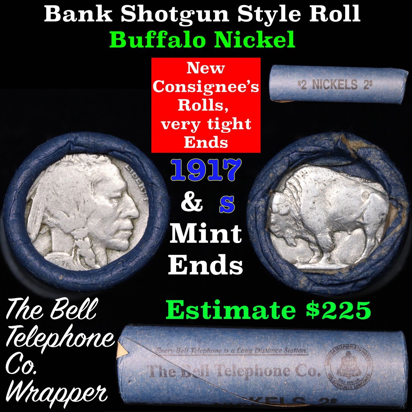 Buffalo Nickel Shotgun Roll in Old Bank Style 'Bell Telephone' Wrapper 1917 & s Mint Ends. The roll is held in an old, rare "Bell Telephone Co." Bank style wrapper. This is the Bell Telephone logo from the 1960's. They are all frrom one Estate. The ends on these rolls are very tight. We will guarantee they are all full dates.