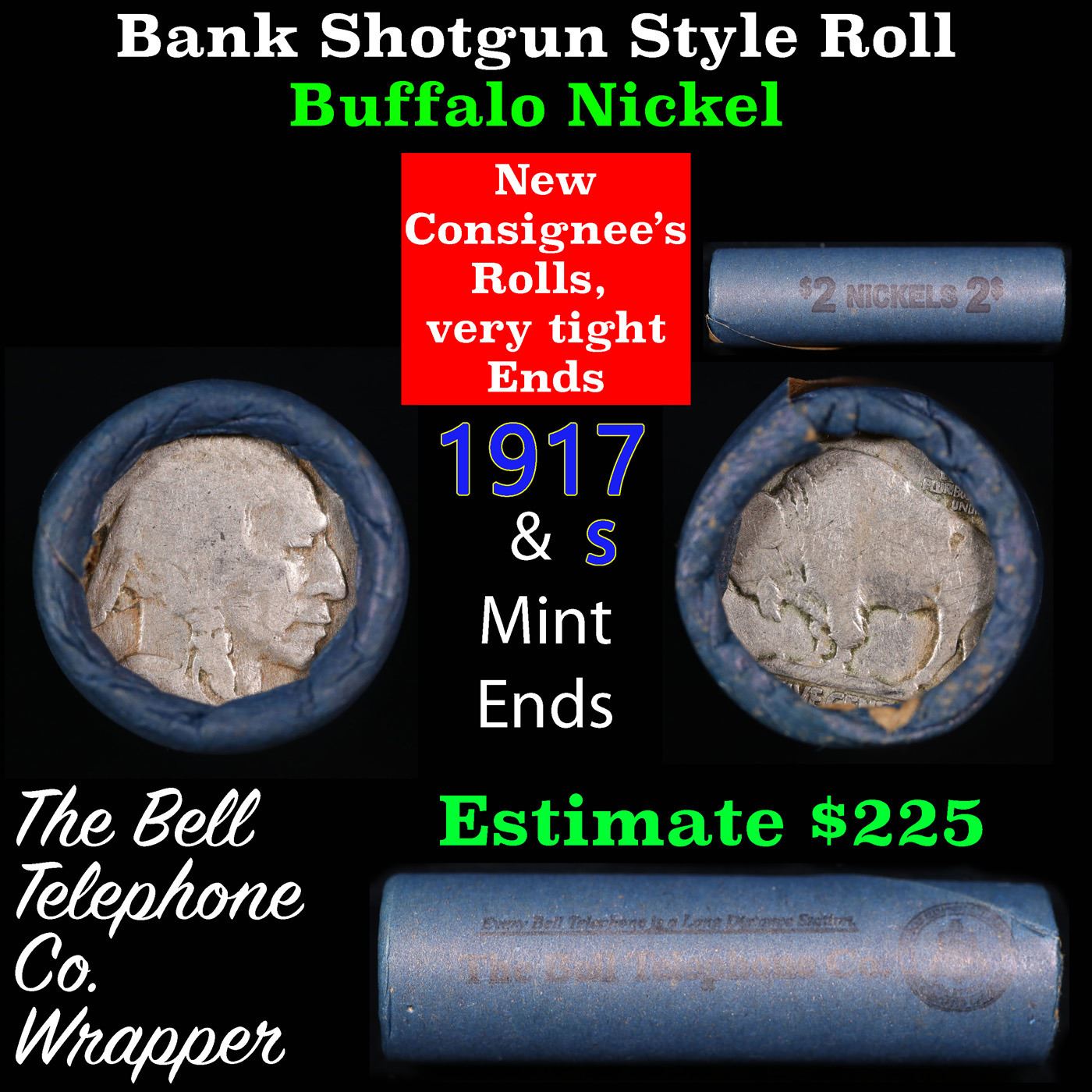 Buffalo Nickel Shotgun Roll in Old Bank Style 'Bell Telephone' Wrapper 1917 & s Mint Ends. The roll is held in an old, rare "Bell Telephone Co." Bank style wrapper. This is the Bell Telephone logo from the 1960's. They are all from one Estate. The ends on these rolls are very tight. We will guarantee they are all full dates.