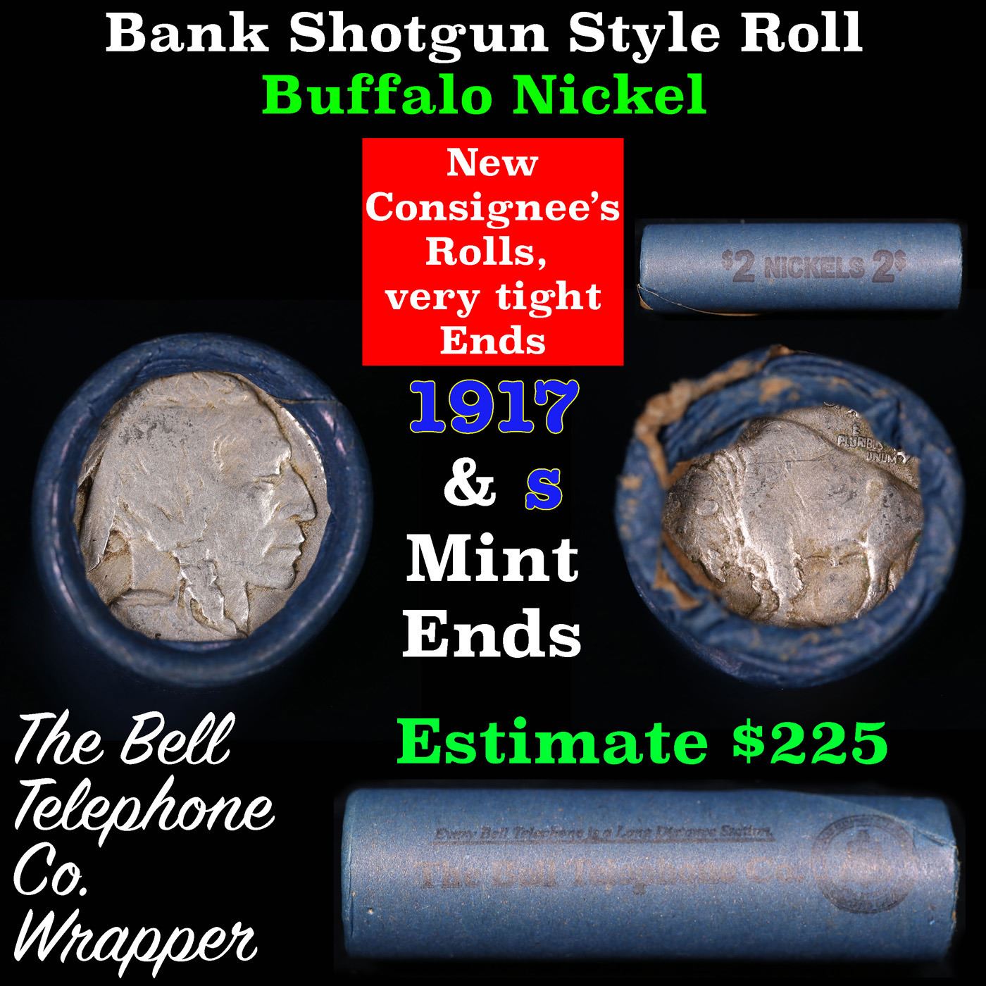 Buffalo Nickel Shotgun Roll in Old Bank Style 'Bell Telephone' Wrapper 1917 & s Mint Ends. The roll is held in an old, rare "Bell Telephone Co." Bank style wrapper. This is the Bell Telephone logo from the 1960's. They are all frrom one Estate. The ends on these rolls are very tight. We will guarantee they are all full dates.