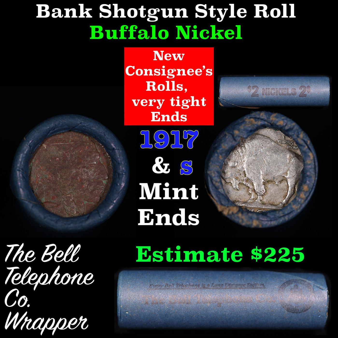 Buffalo Nickel Shotgun Roll in Old Bank Style 'Bell Telephone' Wrapper 1917 & s Mint Ends. The roll is held in an old, rare "Bell Telephone Co." Bank style wrapper. This is the Bell Telephone logo from the 1960's. They are all frrom one Estate. The ends on these rolls are very tight. We will guarantee they are all full dates.