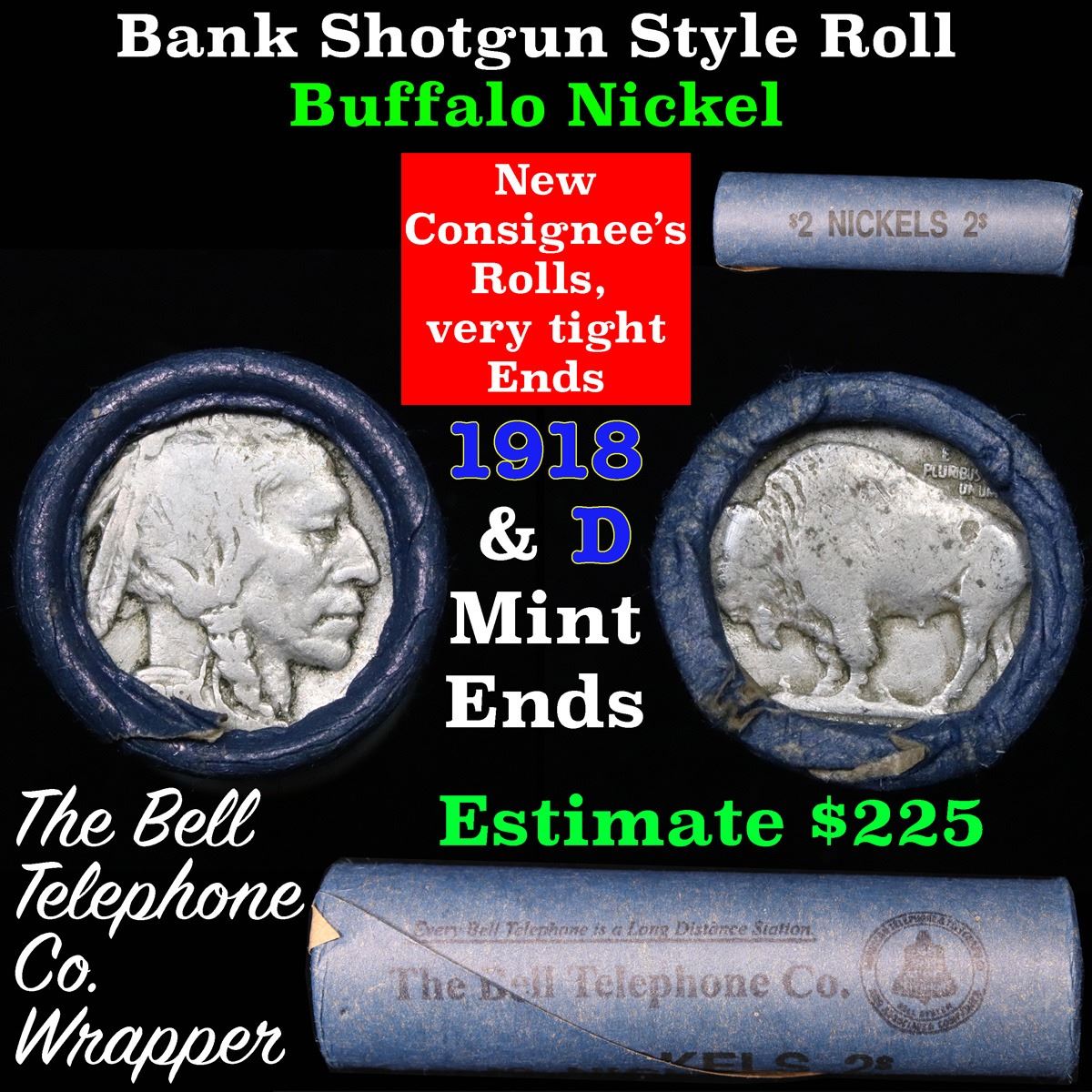 Buffalo Nickel Shotgun Roll in Old Bank Style 'Bell Telephone' Wrapper 1918 & d Mint Ends . .. The roll is held in an old, rare "Bell Telephone Co." Bank style wrapper. This is the Bell Telephone logo from the 1960's. They are all frrom one Estate. The ends on these rolls are very tight. We will guarantee they are all full dates.