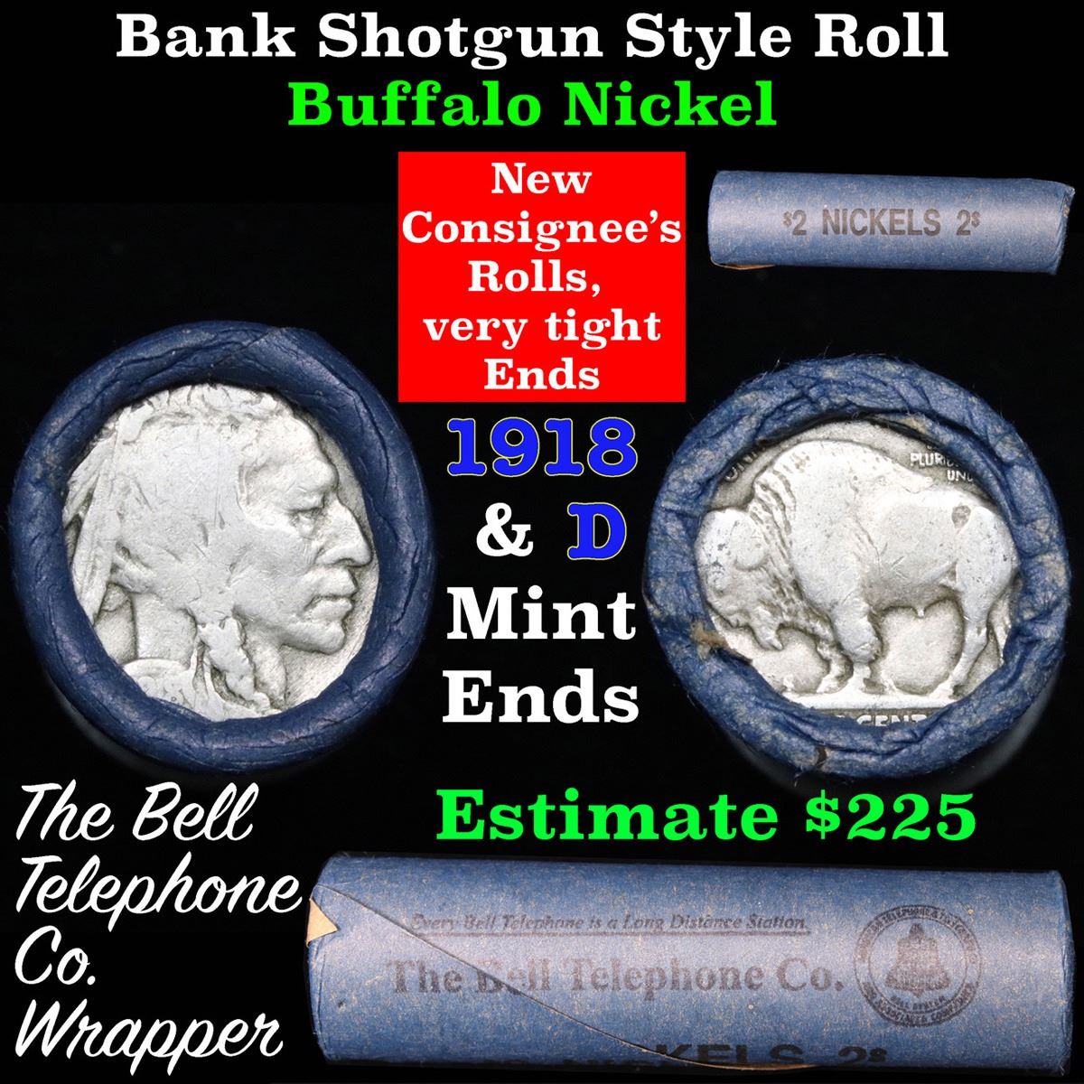 Buffalo Nickel Shotgun Roll in Old Bank Style 'Bell Telephone' Wrapper 1918 & d Mint Ends. The roll is held in an old, rare "Bell Telephone Co." Bank style wrapper. This is the Bell Telephone logo from the 1960's. They are all frrom one Estate. The ends on these rolls are very tight. We will guarantee they are all full dates.