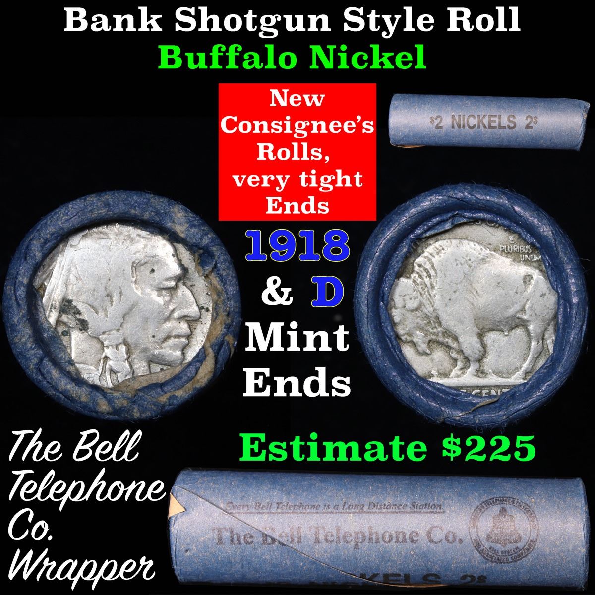 Buffalo Nickel Shotgun Roll in Old Bank Style 'Bell Telephone' Wrapper 1918 & d Mint Ends. The roll is held in an old, rare "Bell Telephone Co." Bank style wrapper. This is the Bell Telephone logo from the 1960's. They are all frrom one Estate. The ends on these rolls are very tight. We will guarantee they are all full dates.