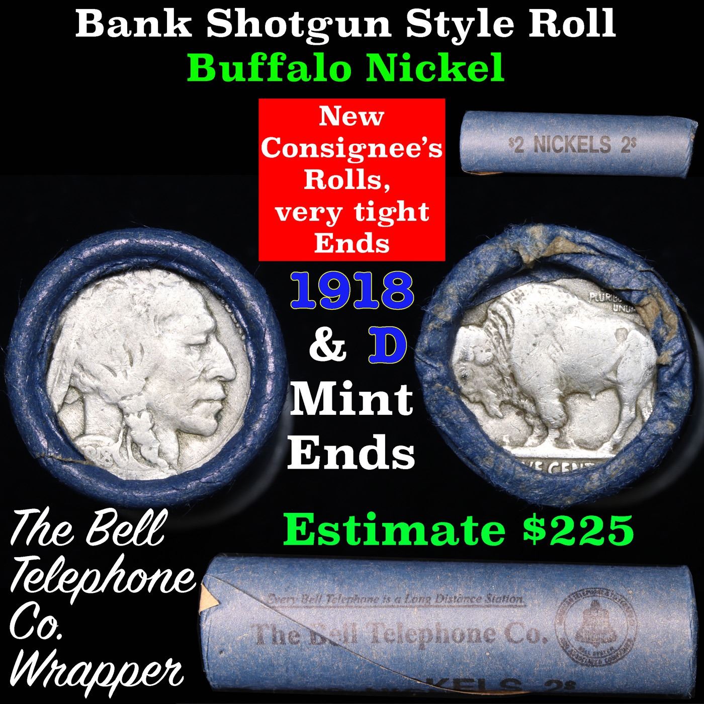 Buffalo Nickel Shotgun Roll in Old Bank Style 'Bell Telephone' Wrapper 1918 & d Mint Ends. The roll is held in an old, rare "Bell Telephone Co." Bank style wrapper. This is the Bell Telephone logo from the 1960's. They are all from one Estate. The ends on these rolls are very tight. We will guarantee they are all full dates.