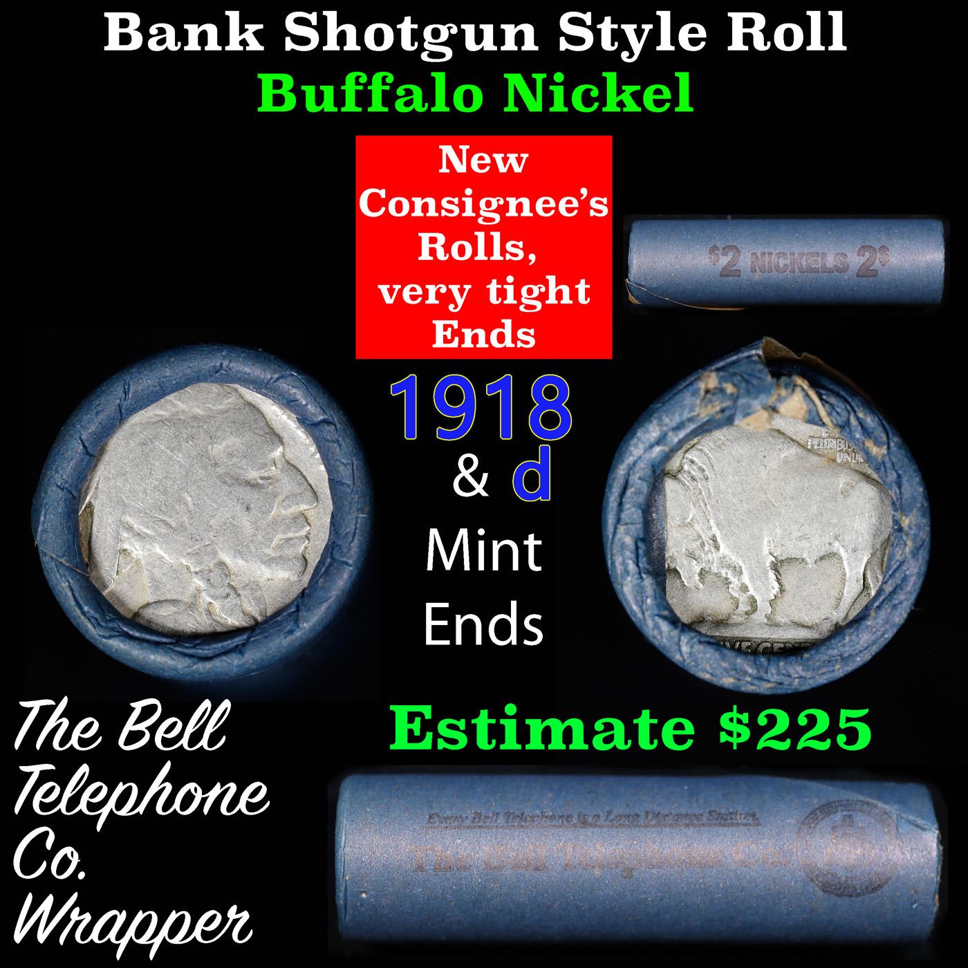 Buffalo Nickel Shotgun Roll in Old Bank Style 'Bell Telephone' Wrapper 1918 &d Mint Ends. The roll is held in an old, rare "Bell Telephone Co." Bank style wrapper. This is the Bell Telephone logo from the 1960's. They are all frrom one Estate. The ends on these rolls are very tight. We will guarantee they are all full dates.