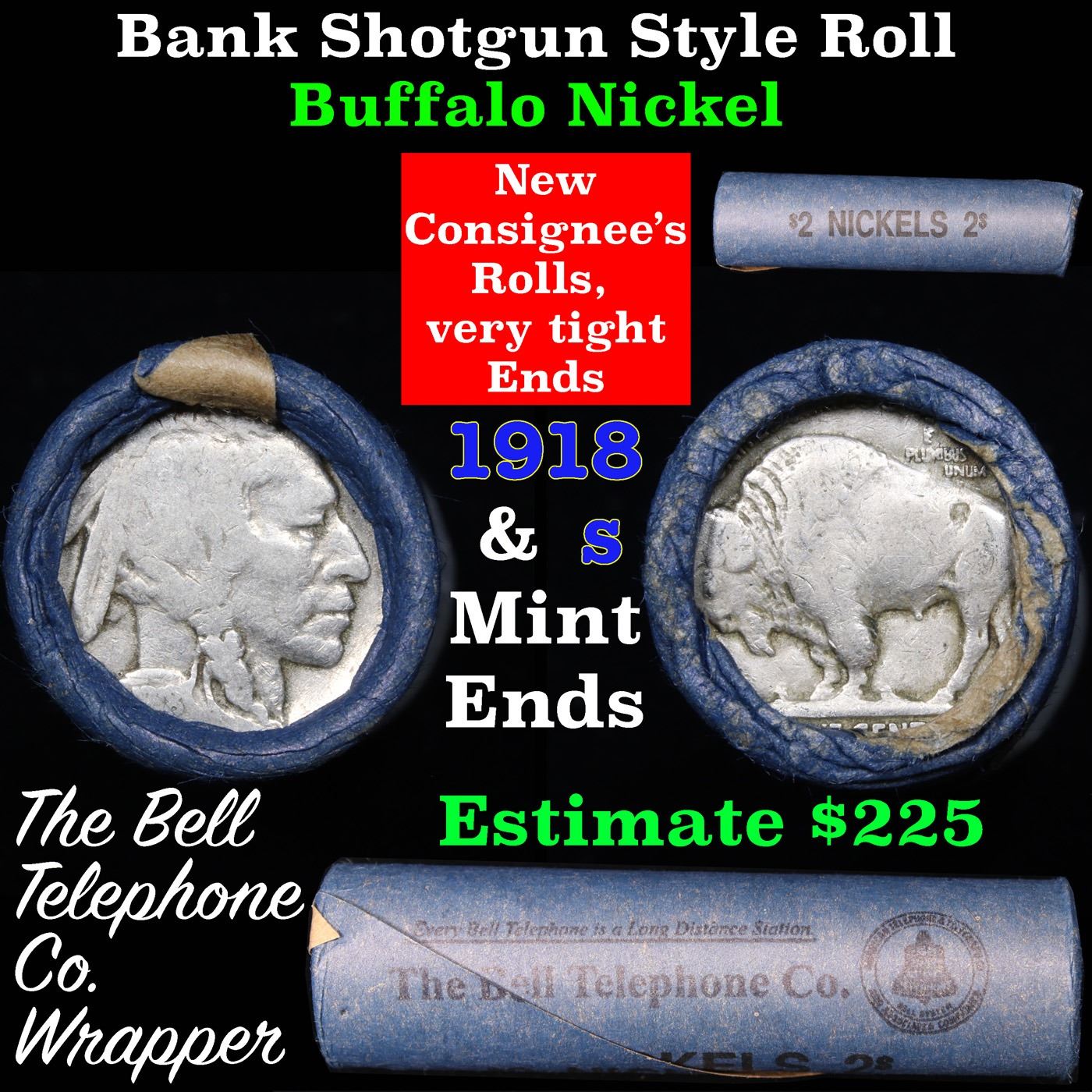 Buffalo Nickel Shotgun Roll in Old Bank Style 'Bell Telephone' Wrapper 1918 & s Mint Ends Grades