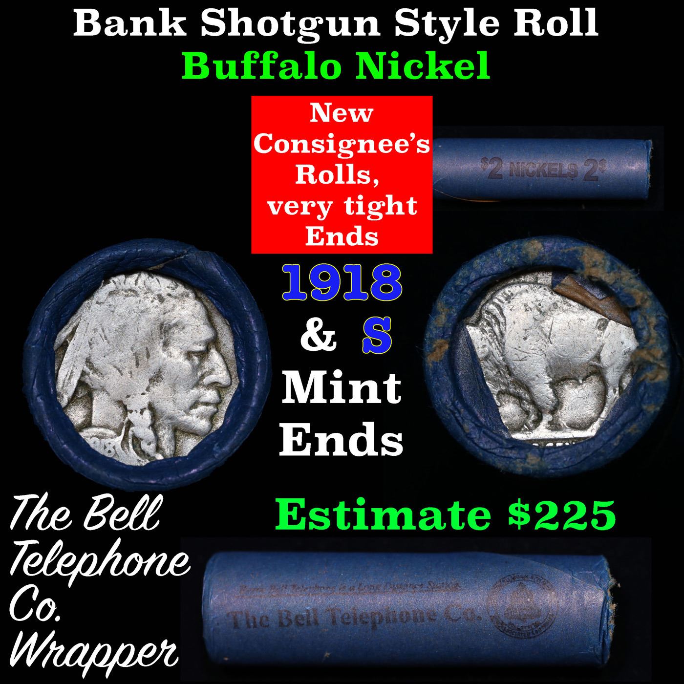Buffalo Nickel Shotgun Roll in Old Bank Style 'Bell Telephone' Wrapper 1918 & s Mint Ends. The roll is held in an old, rare "Bell Telephone Co." Bank style wrapper. This is the Bell Telephone logo from the 1960's. They are all frrom one Estate. The ends on these rolls are very tight. We will guarantee they are all full dates.