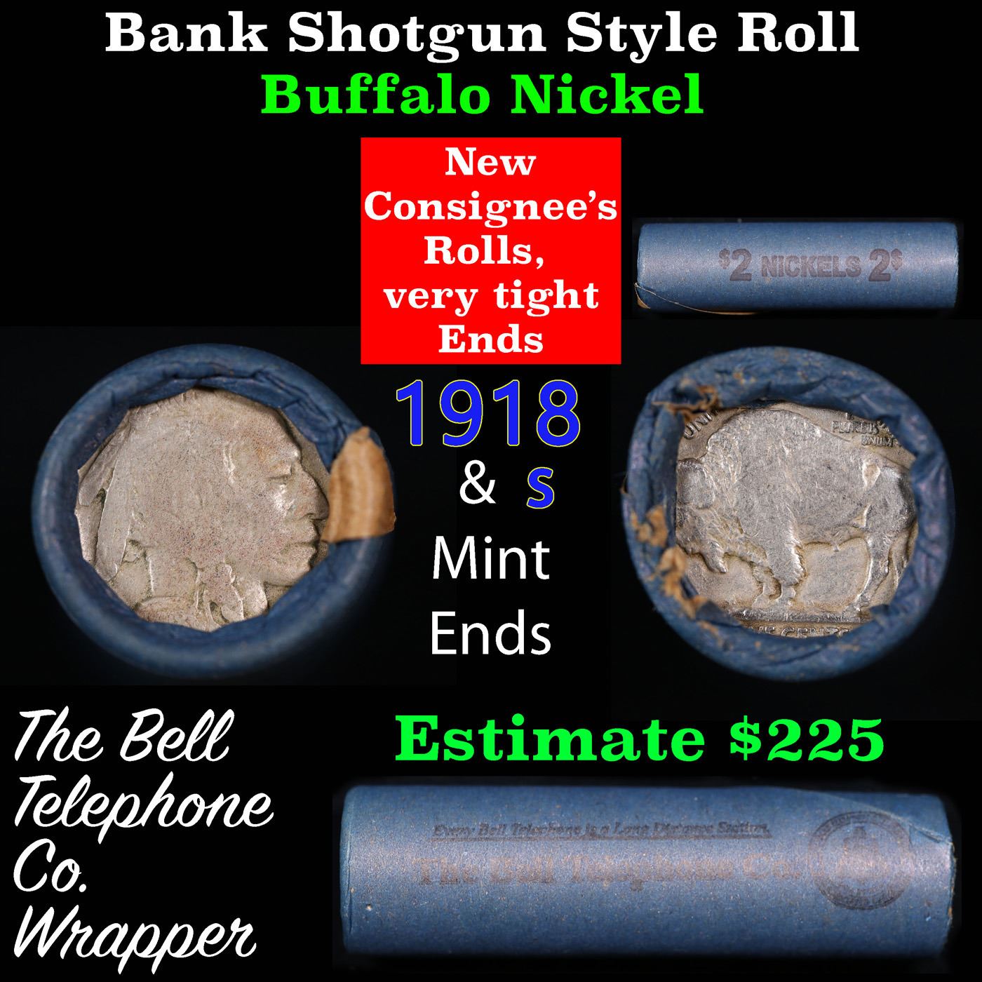 Buffalo Nickel Shotgun Roll in Old Bank Style 'Bell Telephone' Wrapper 1918 & s Mint Ends. The roll is held in an old, rare "Bell Telephone Co." Bank style wrapper. This is the Bell Telephone logo from the 1960's. They are all from one Estate. The ends on these rolls are very tight. We will guarantee they are all full dates.