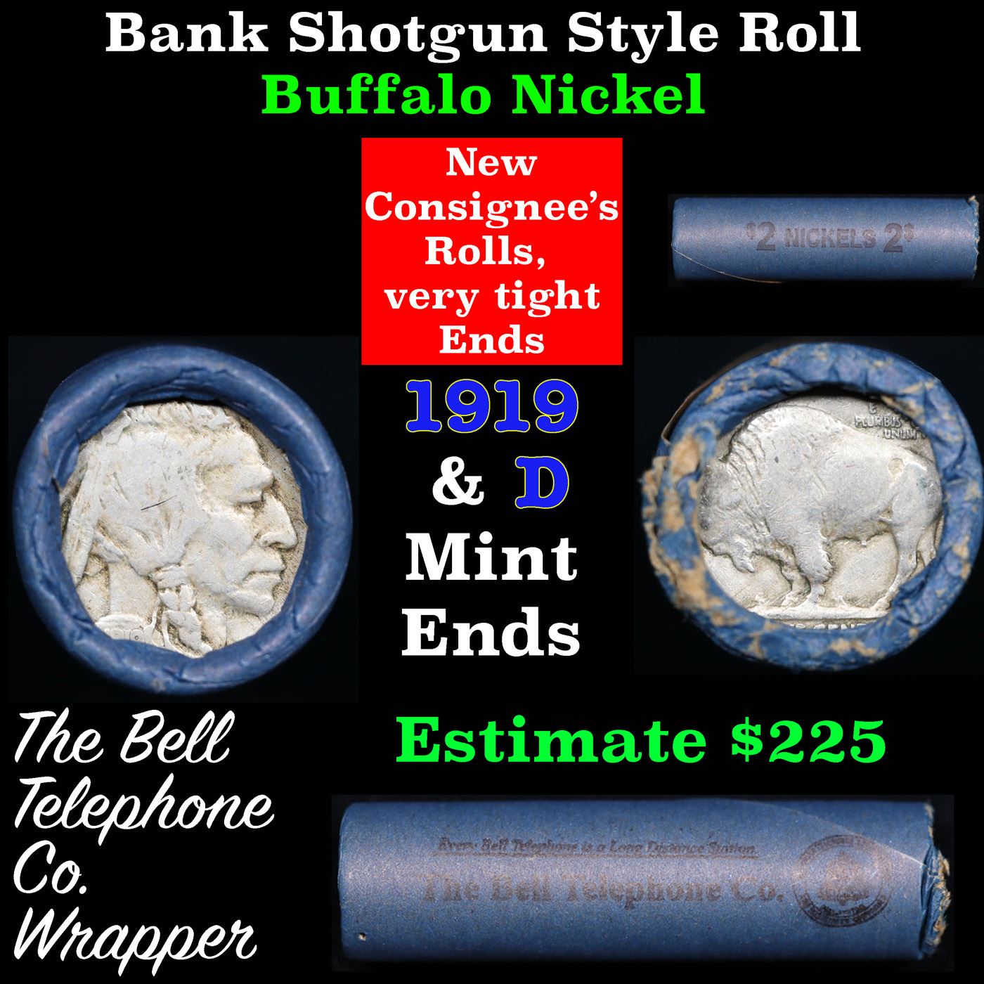 Buffalo Nickel Shotgun Roll in Old Bank Style 'Bell Telephone' Wrapper 1919 & D Mint Ends. The roll is held in an old, rare "Bell Telephone Co." Bank style wrapper. This is the Bell Telephone logo from the 1960's. They are all frrom one Estate. The ends on these rolls are very tight. We will guarantee they are all full dates.