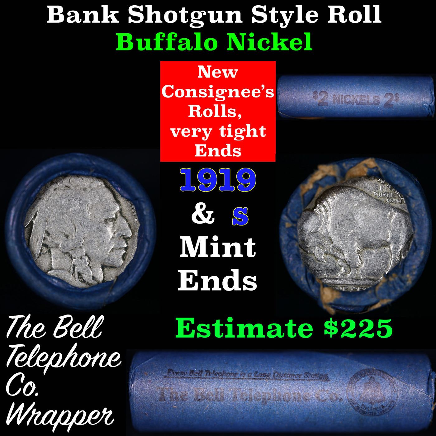 Buffalo Nickel Shotgun Roll in Old Bank Style 'Bell Telephone' Wrapper 1919 & S Mint Ends. The roll is held in an old, rare "Bell Telephone Co." Bank style wrapper. This is the Bell Telephone logo from the 1960's. They are all frrom one Estate. The ends on these rolls are very tight. We will guarantee they are all full dates.