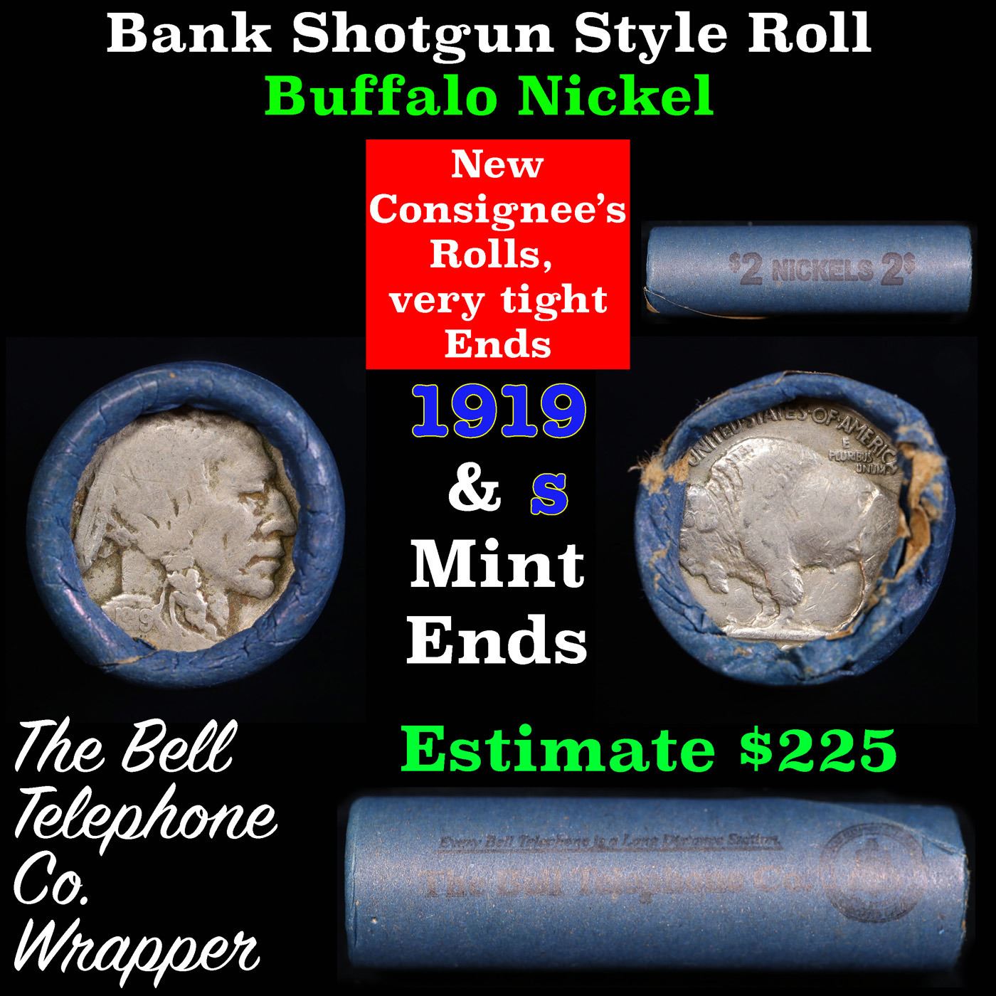 Buffalo Nickel Shotgun Roll in Old Bank Style 'Bell Telephone' Wrapper 1919 & S Mint Ends. The roll is held in an old, rare "Bell Telephone Co." Bank style wrapper. This is the Bell Telephone logo from the 1960's. They are all frrom one Estate. The ends on these rolls are very tight. We will guarantee they are all full dates.