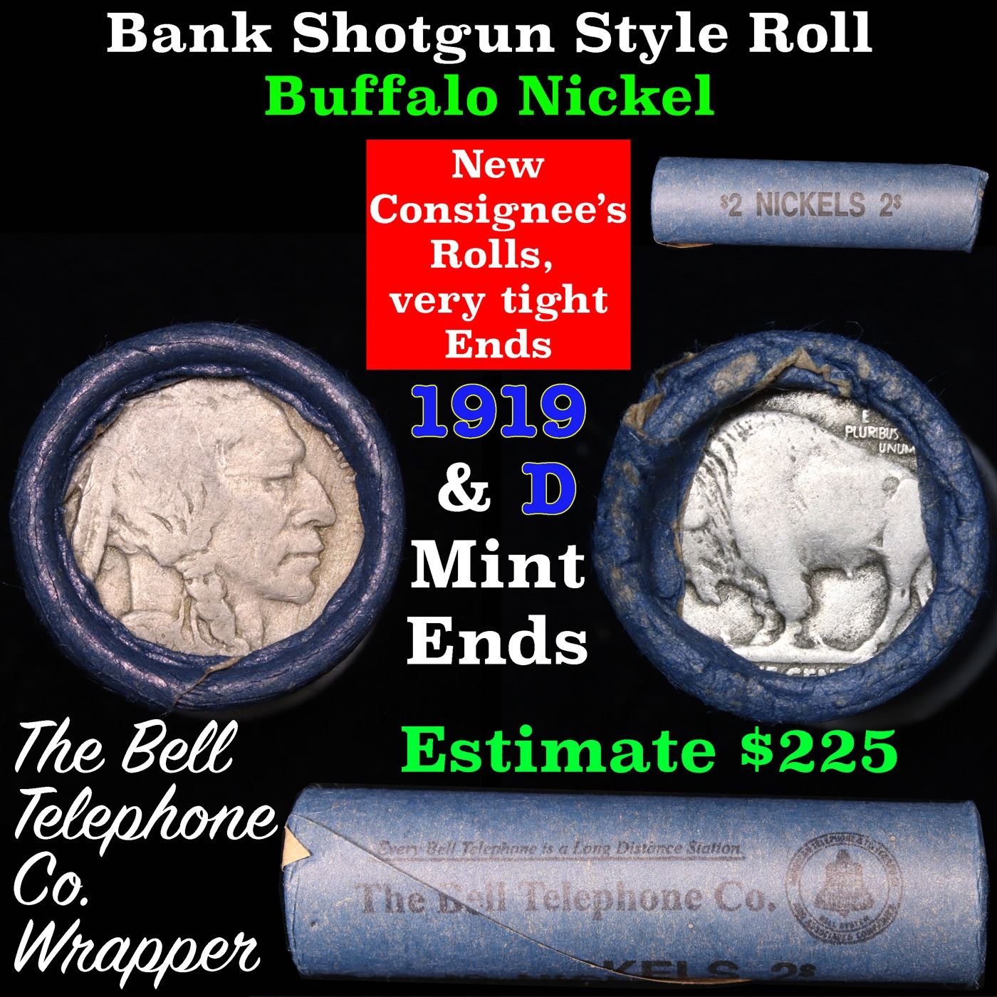 Buffalo Nickel Shotgun Roll in Old Bank Style 'Bell Telephone' Wrapper 1919 & d Mint Ends Grades. The roll is held in an old, rare "Bell Telephone Co." Bank style wrapper. This is the Bell Telephone logo from the 1960's. They are all frrom one Estate. The ends on these rolls are very tight. We will guarantee they are all full dates.