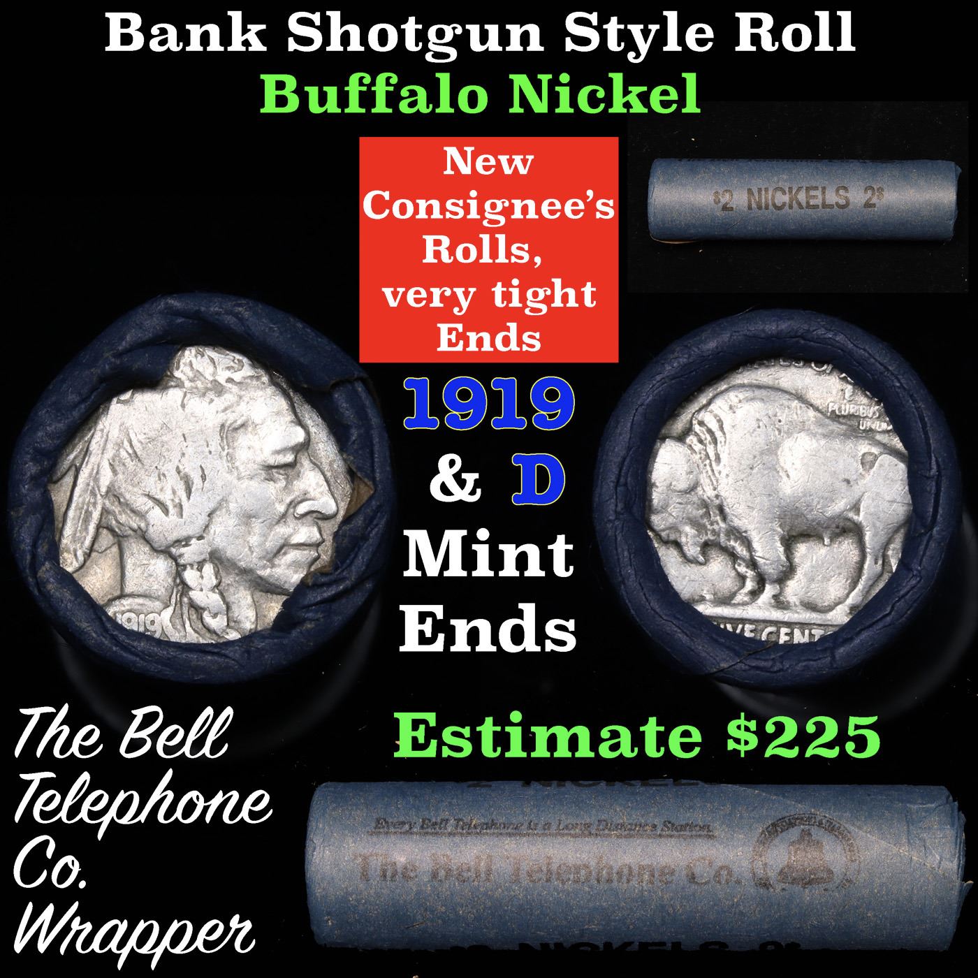 Buffalo Nickel Shotgun Roll in Old Bank Style 'Bell Telephone' Wrapper 1919 & d Mint Ends Grades