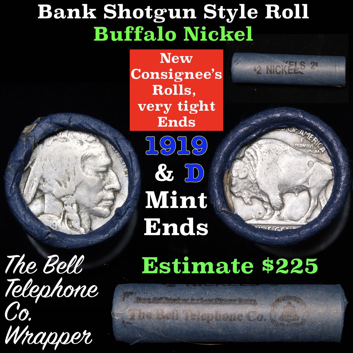 Buffalo Nickel Shotgun Roll in Old Bank Style 'Bell Telephone' Wrapper 1919 & d Mint Ends Grades