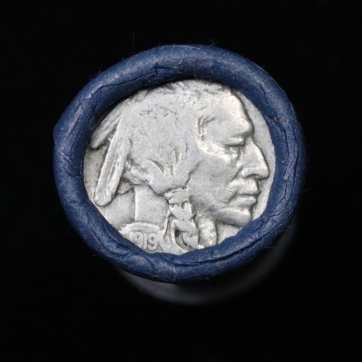 Buffalo Nickel Shotgun Roll in Old Bank Style 'Bell Telephone' Wrapper 1919 & d Mint Ends . .. The roll is held in an old, rare "Bell Telephone Co." Bank style wrapper. This is the Bell Telephone logo from the 1960's. They are all frrom one Estate. The ends on these rolls are very tight. We will guarantee they are all full dates.