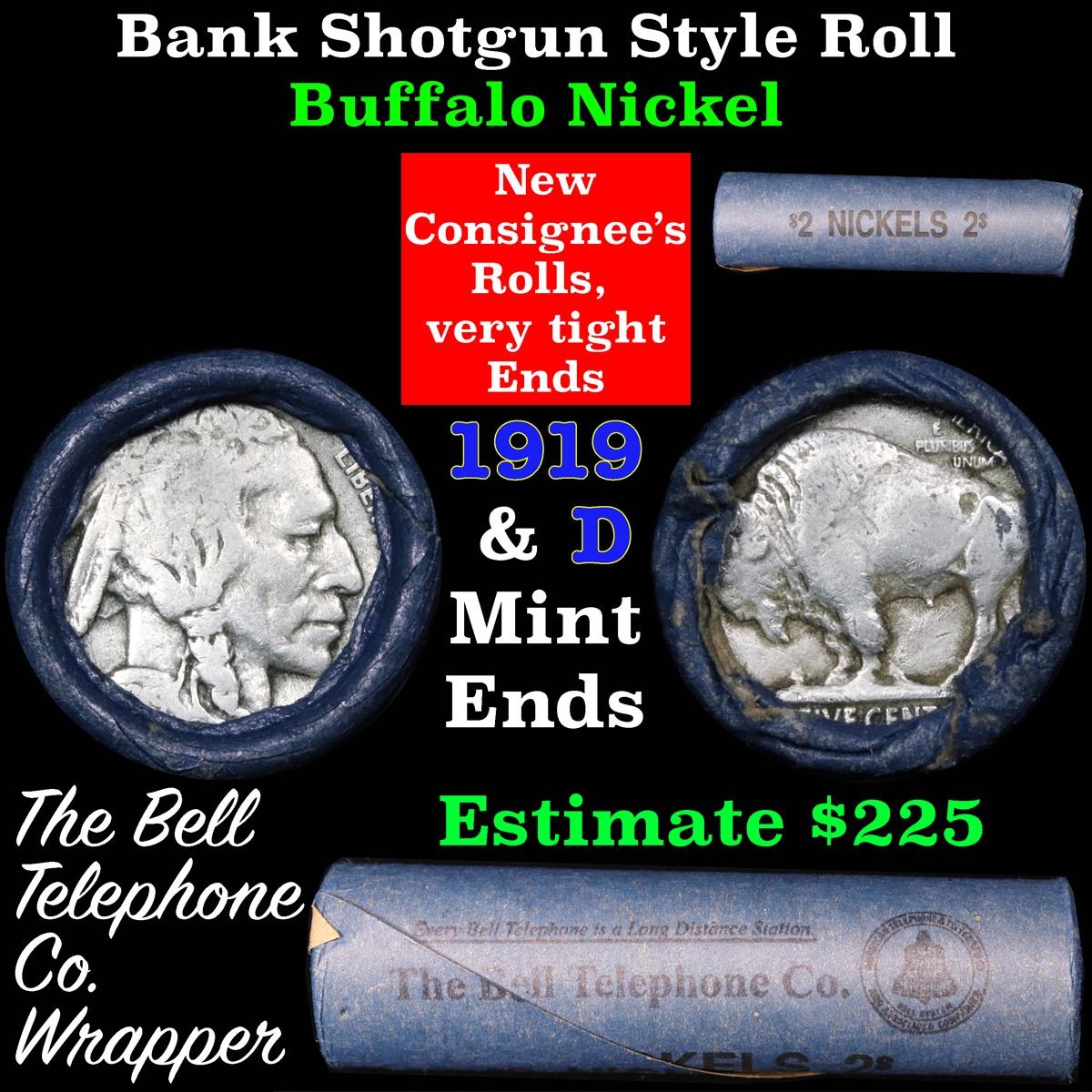 Buffalo Nickel Shotgun Roll in Old Bank Style 'Bell Telephone' Wrapper 1919 & d Mint Ends . .. The roll is held in an old, rare "Bell Telephone Co." Bank style wrapper. This is the Bell Telephone logo from the 1960's. They are all frrom one Estate. The ends on these rolls are very tight. We will guarantee they are all full dates.