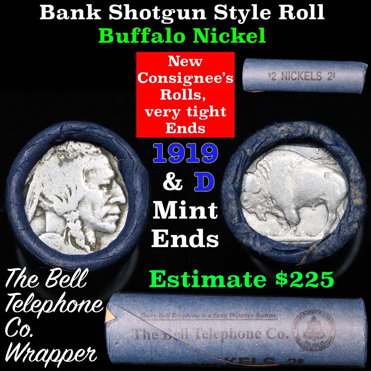 Buffalo Nickel Shotgun Roll in Old Bank Style 'Bell Telephone' Wrapper 1919 & d Mint Ends. The roll is held in an old, rare "Bell Telephone Co." Bank style wrapper. This is the Bell Telephone logo from the 1960's. They are all frrom one Estate. The ends on these rolls are very tight. We will guarantee they are all full dates.