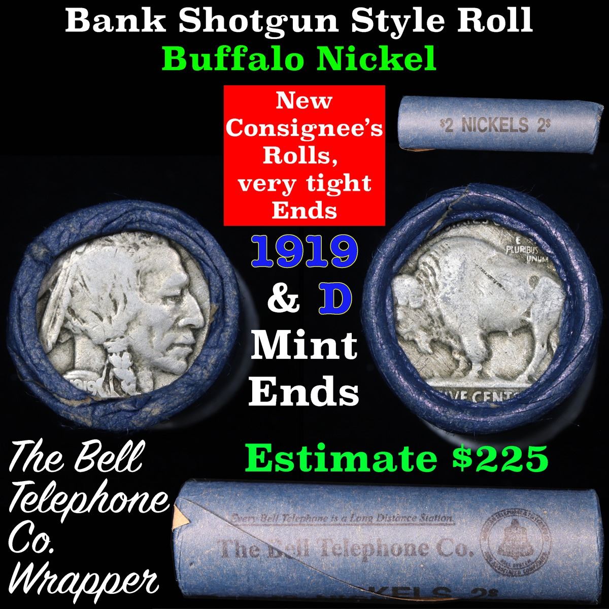Buffalo Nickel Shotgun Roll in Old Bank Style 'Bell Telephone'  Wrapper 1919 & d Mint Ends.        The roll is held in an old, rare "Bell Telephone Co." Bank style wrapper. This is the Bell Telephone logo from the 1960's. They are all frrom one Estate. The ends on these rolls are very tight. We will guarantee they are all full dates.