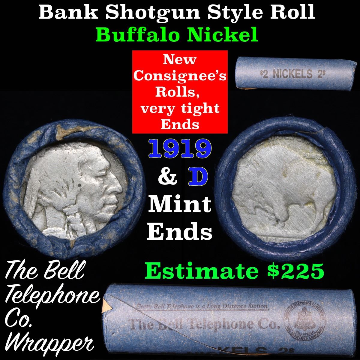 Buffalo Nickel Shotgun Roll in Old Bank Style 'Bell Telephone' Wrapper 1919 & d Mint Ends. The roll is held in an old, rare "Bell Telephone Co." Bank style wrapper. This is the Bell Telephone logo from the 1960's. They are all frrom one Estate. The ends on these rolls are very tight. We will guarantee they are all full dates.