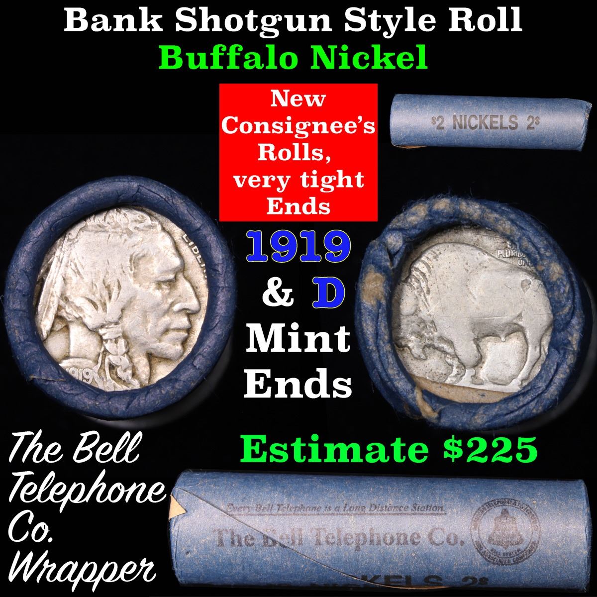 Buffalo Nickel Shotgun Roll in Old Bank Style 'Bell Telephone' Wrapper 1919 & d Mint Ends. The roll is held in an old, rare "Bell Telephone Co." Bank style wrapper. This is the Bell Telephone logo from the 1960's. They are all frrom one Estate. The ends on these rolls are very tight. We will guarantee they are all full dates.