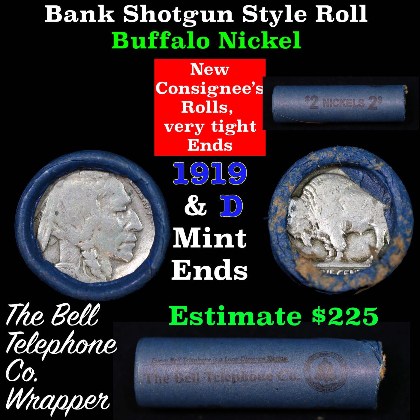Buffalo Nickel Shotgun Roll in Old Bank Style 'Bell Telephone' Wrapper 1919 & d Mint Ends. The roll is held in an old, rare "Bell Telephone Co." Bank style wrapper. This is the Bell Telephone logo from the 1960's. They are all frrom one Estate. The ends on these rolls are very tight. We will guarantee they are all full dates.