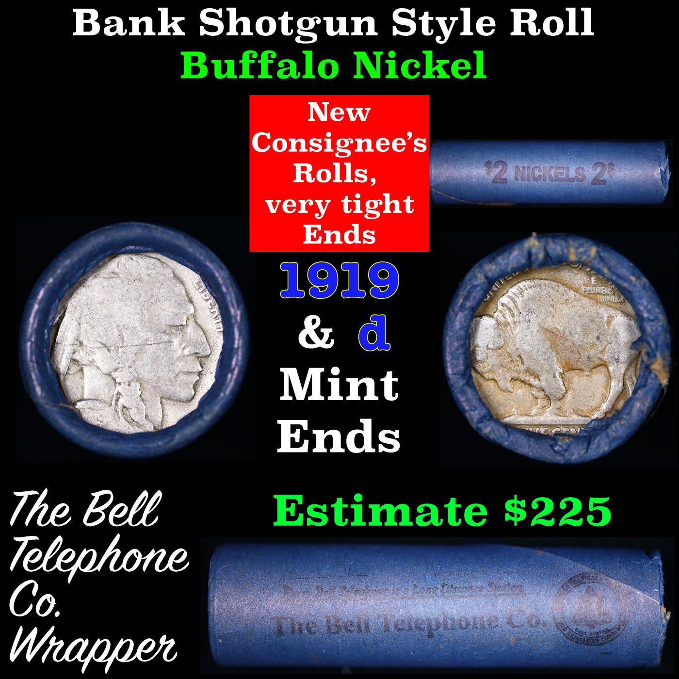 Buffalo Nickel Shotgun Roll in Old Bank Style 'Bell Telephone' Wrapper 1919 & d Mint Ends. The roll is held in an old, rare "Bell Telephone Co." Bank style wrapper. This is the Bell Telephone logo from the 1960's. They are all frrom one Estate. The ends on these rolls are very tight. We will guarantee they are all full dates.