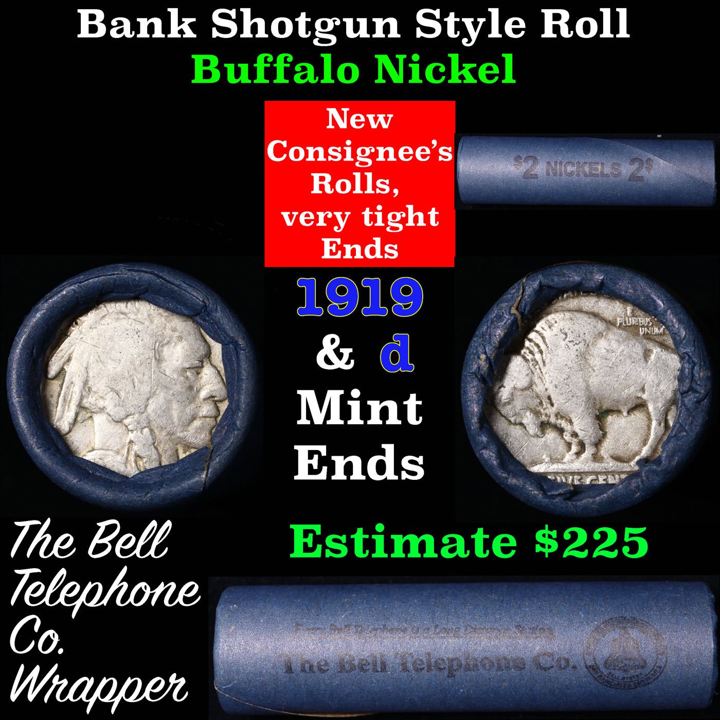 Buffalo Nickel Shotgun Roll in Old Bank Style 'Bell Telephone' Wrapper 1919 & d Mint Ends. The roll is held in an old, rare "Bell Telephone Co." Bank style wrapper. This is the Bell Telephone logo from the 1960's. They are all frrom one Estate. The ends on these rolls are very tight. We will guarantee they are all full dates.