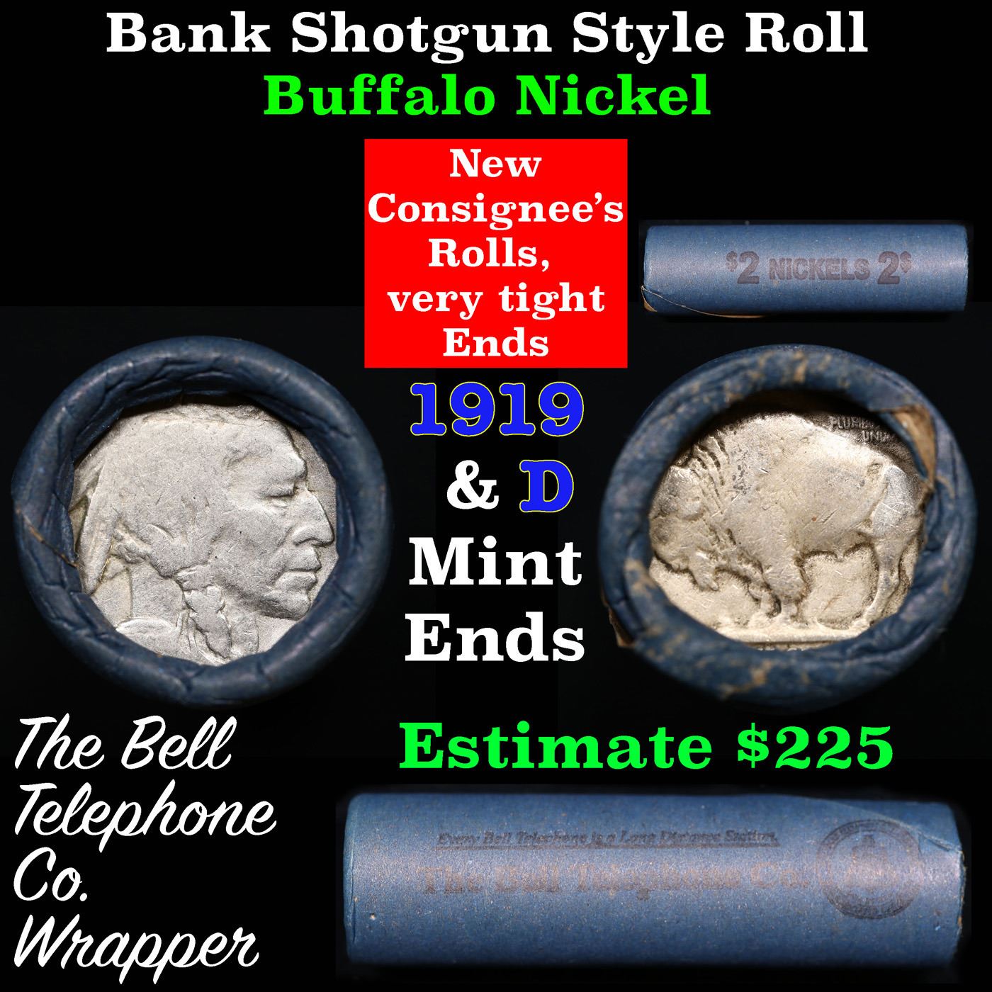 Buffalo Nickel Shotgun Roll in Old Bank Style 'Bell Telephone' Wrapper 1919 &d Mint Ends. The roll is held in an old, rare "Bell Telephone Co." Bank style wrapper. This is the Bell Telephone logo from the 1960's. They are all frrom one Estate. The ends on these rolls are very tight. We will guarantee they are all full dates.