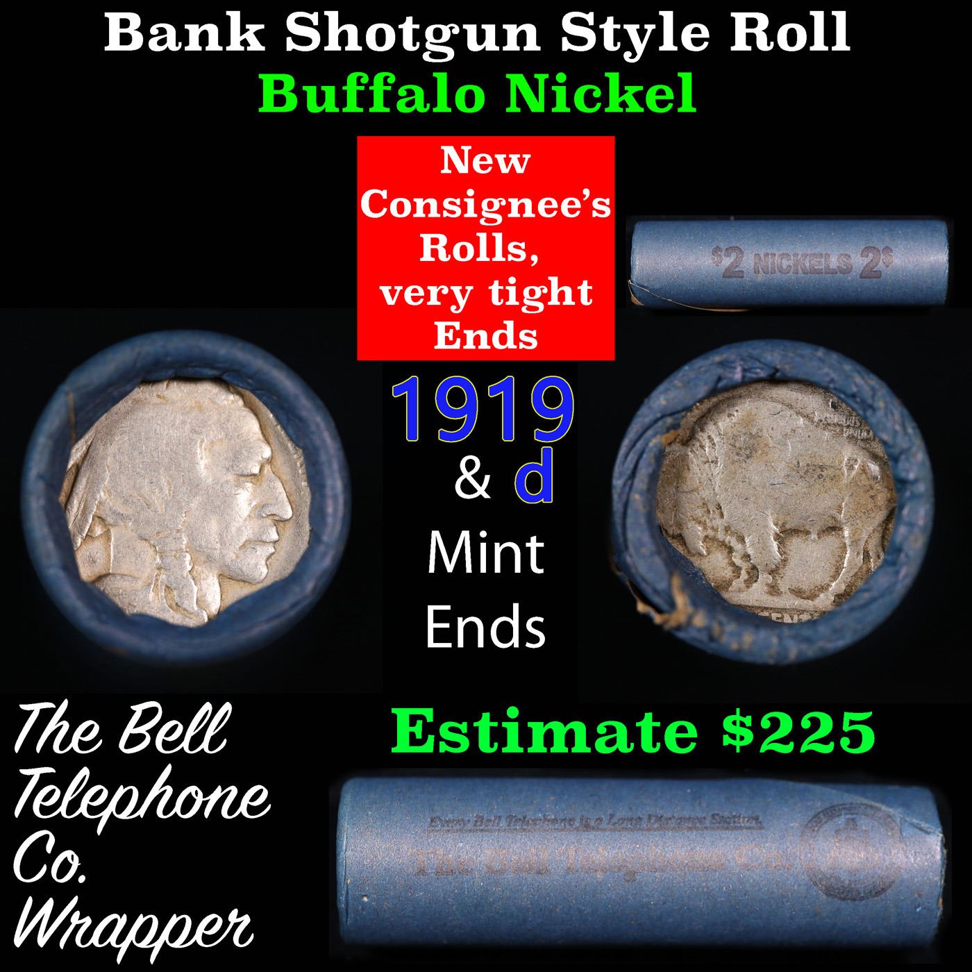 Buffalo Nickel Shotgun Roll in Old Bank Style 'Bell Telephone' Wrapper 1919 & d Mint Ends. The roll is held in an old, rare "Bell Telephone Co." Bank style wrapper. This is the Bell Telephone logo from the 1960's. They are all from one Estate. The ends on these rolls are very tight. We will guarantee they are all full dates.