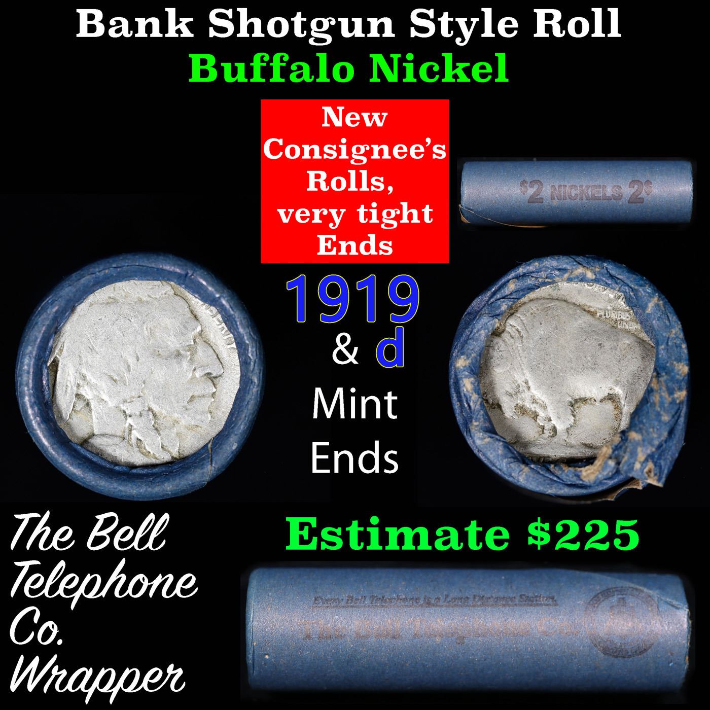 Buffalo Nickel Shotgun Roll in Old Bank Style 'Bell Telephone' Wrapper 1919 &d Mint Ends. The roll is held in an old, rare "Bell Telephone Co." Bank style wrapper. This is the Bell Telephone logo from the 1960's. They are all frrom one Estate. The ends on these rolls are very tight. We will guarantee they are all full dates.