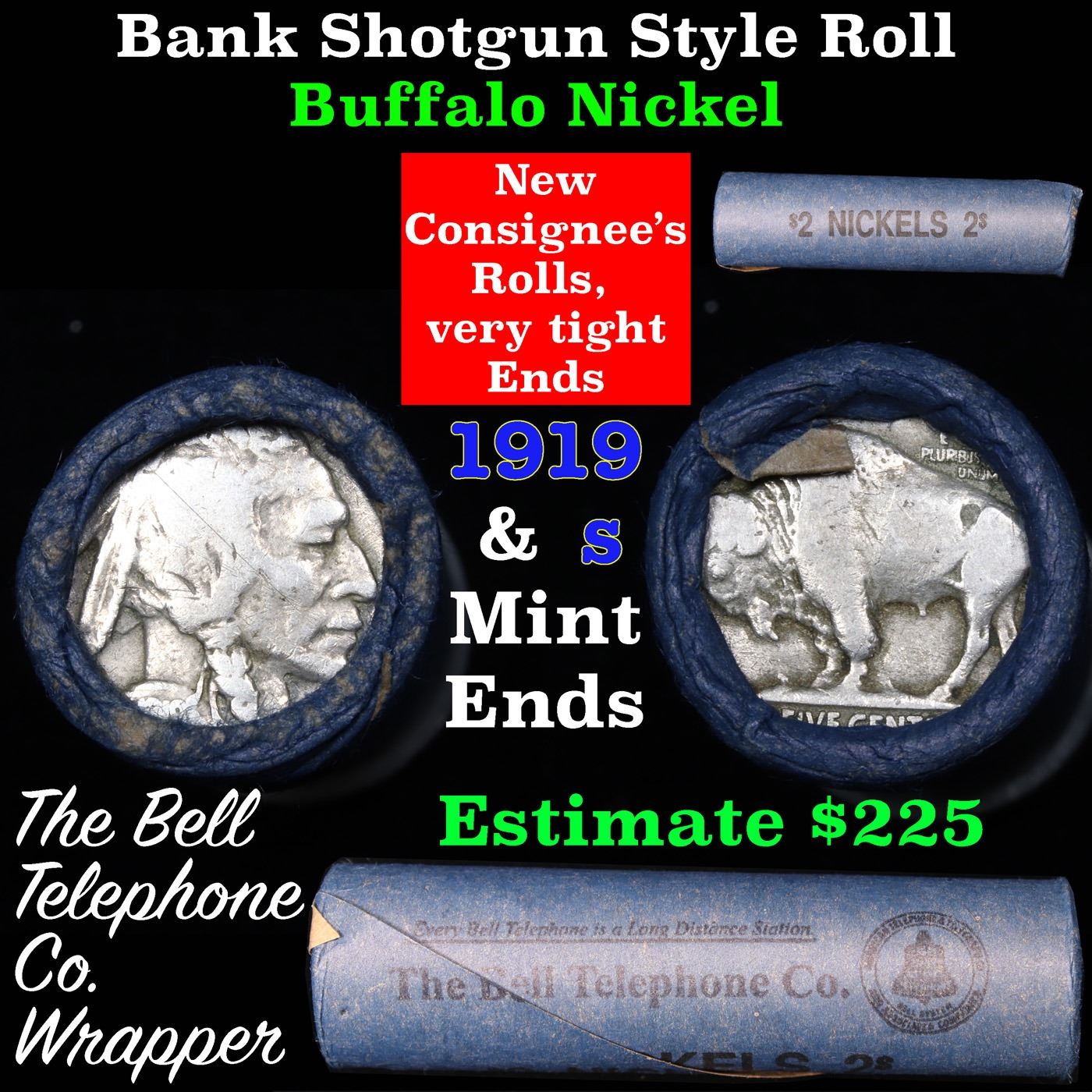 Buffalo Nickel Shotgun Roll in Old Bank Style 'Bell Telephone' Wrapper 1919 & s Mint Ends Grades. The roll is held in an old, rare "Bell Telephone Co." Bank style wrapper. This is the Bell Telephone logo from the 1960's. They are all frrom one Estate. The ends on these rolls are very tight. We will guarantee they are all full dates.