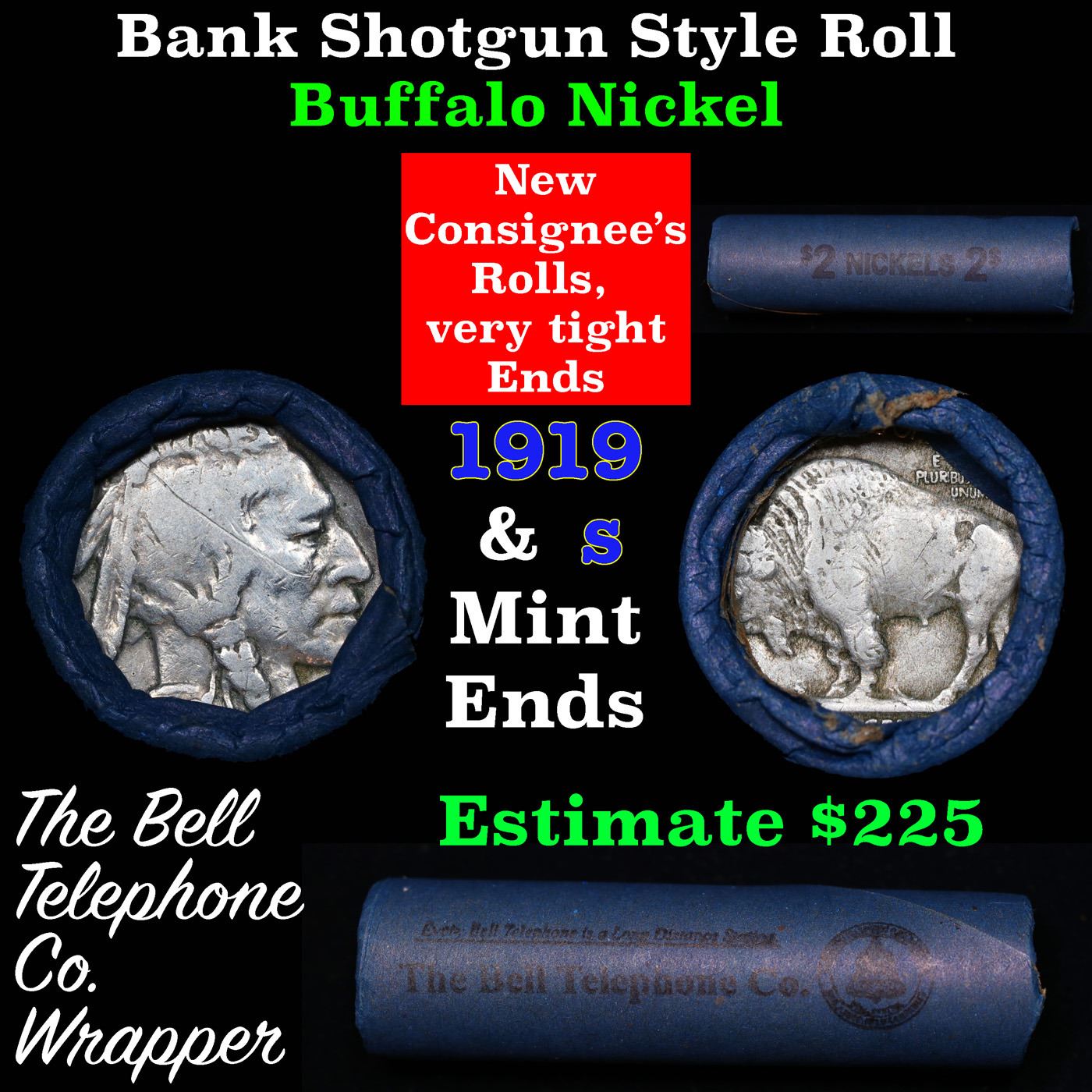 Buffalo Nickel Shotgun Roll in Old Bank Style 'Bell Telephone' Wrapper 1919 & s Mint Ends. The roll is held in an old, rare "Bell Telephone Co." Bank style wrapper. This is the Bell Telephone logo from the 1960's. They are all frrom one Estate. The ends on these rolls are very tight. We will guarantee they are all full dates.