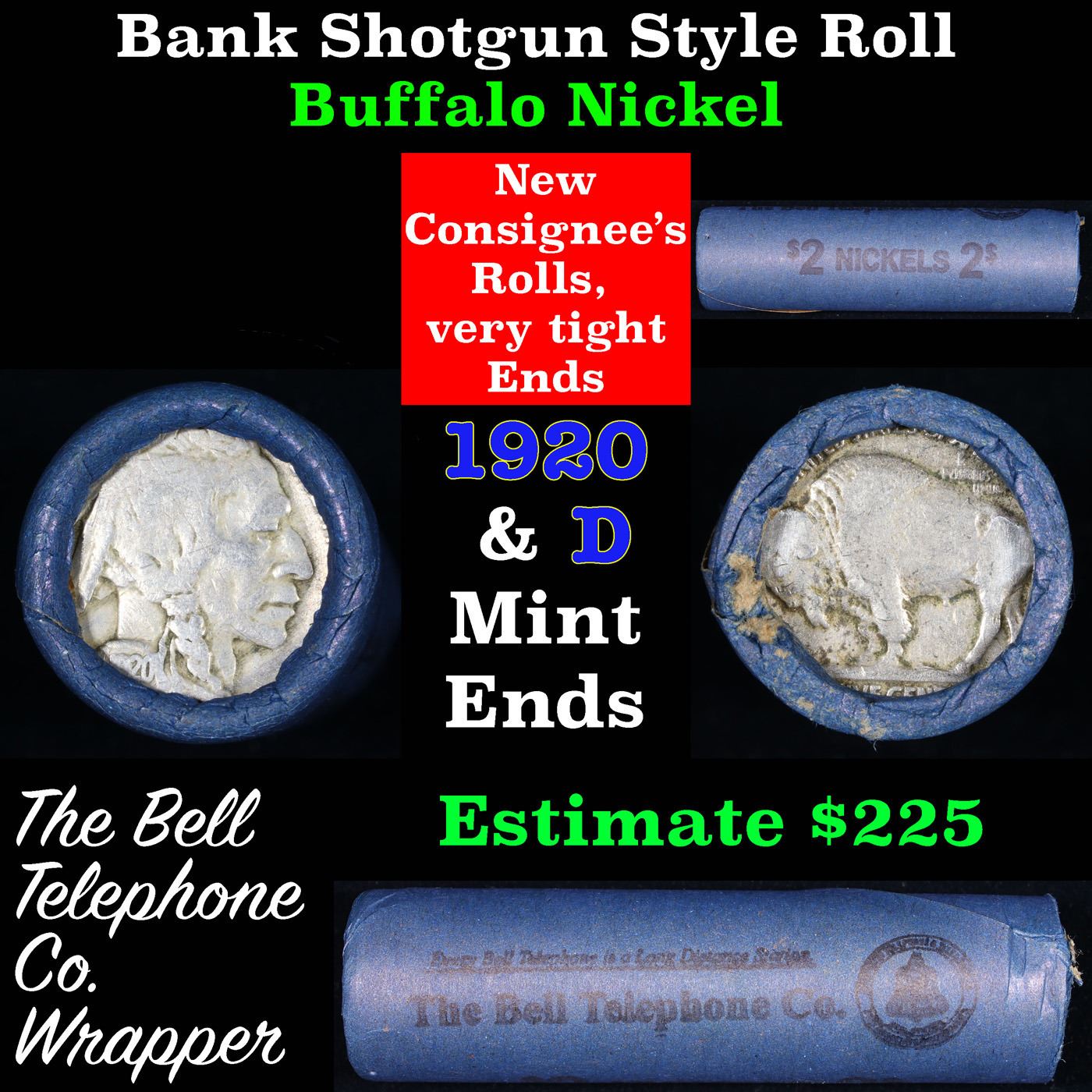 Buffalo Nickel Shotgun Roll in Old Bank Style 'Bell Telephone' Wrapper 1920 & D Mint Ends. The roll is held in an old, rare "Bell Telephone Co." Bank style wrapper. This is the Bell Telephone logo from the 1960's. They are all frrom one Estate. The ends on these rolls are very tight. We will guarantee they are all full dates.