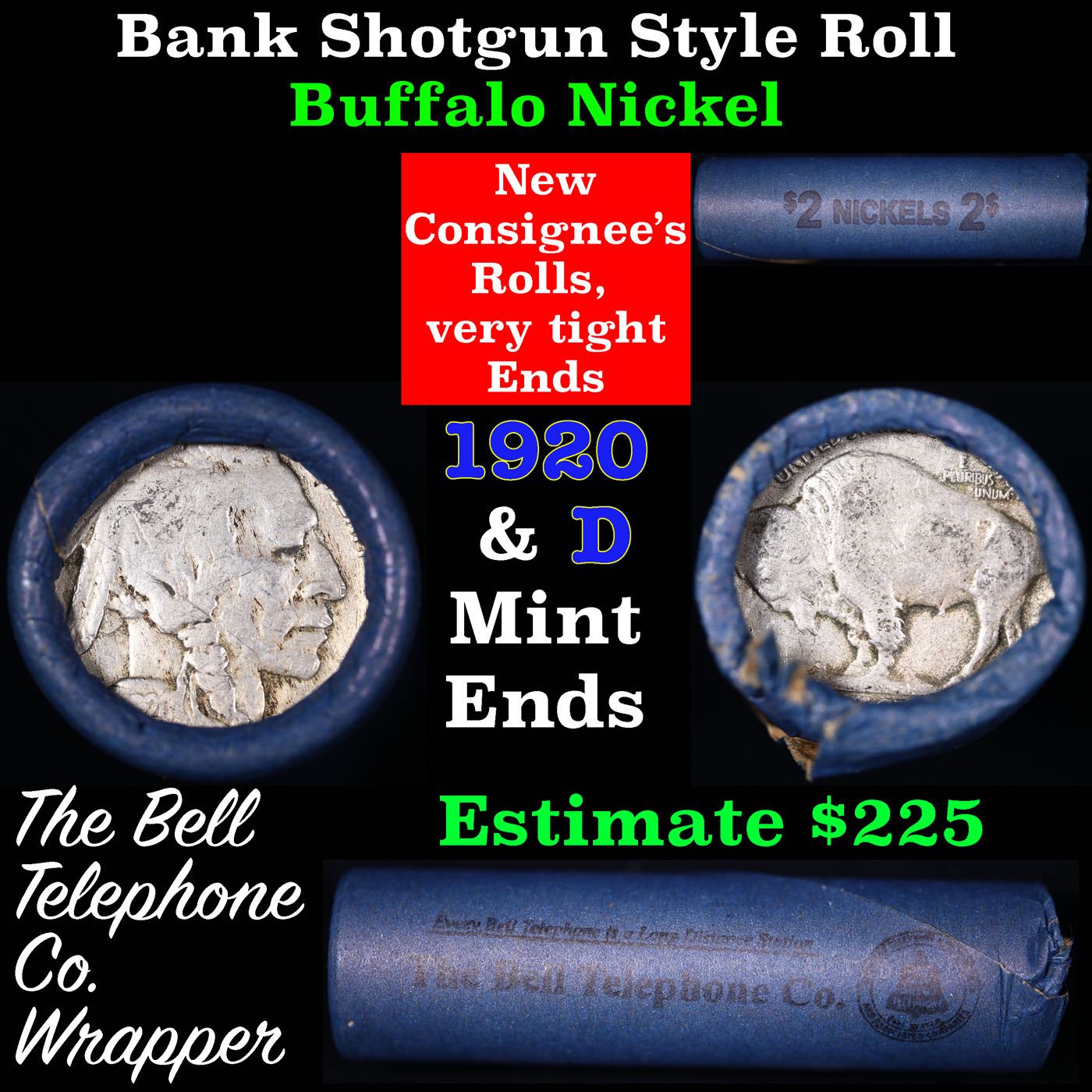 Buffalo Nickel Shotgun Roll in Old Bank Style 'Bell Telephone' Wrapper 1920 & D Mint Ends. The roll is held in an old, rare "Bell Telephone Co." Bank style wrapper. This is the Bell Telephone logo from the 1960's. They are all frrom one Estate. The ends on these rolls are very tight. We will guarantee they are all full dates.