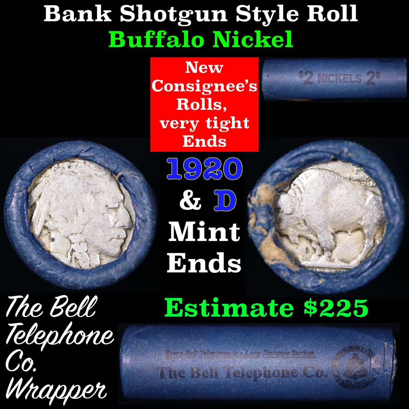 Buffalo Nickel Shotgun Roll in Old Bank Style 'Bell Telephone' Wrapper 1920 & D Mint Ends