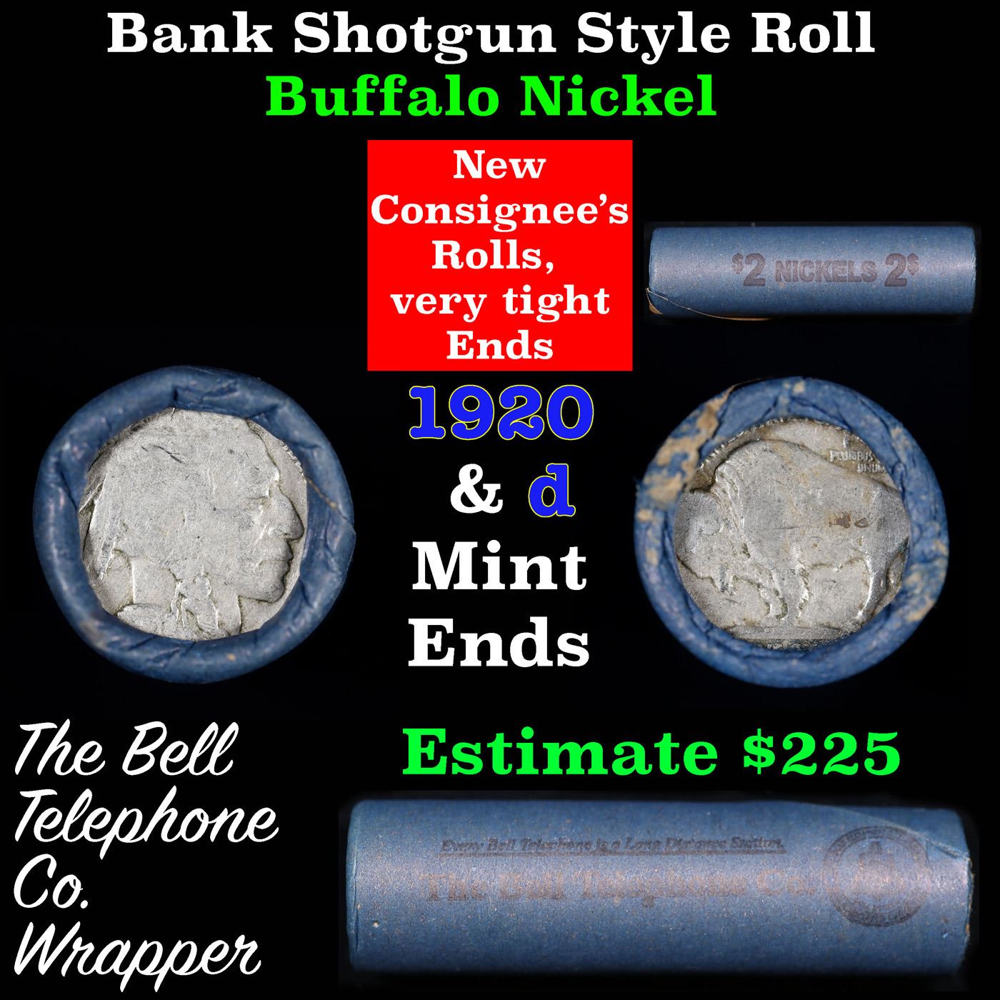 Buffalo Nickel Shotgun Roll in Old Bank Style 'Bell Telephone' Wrapper 1920 & D Mint Ends. The roll is held in an old, rare "Bell Telephone Co." Bank style wrapper. This is the Bell Telephone logo from the 1960's. They are all frrom one Estate. The ends on these rolls are very tight. We will guarantee they are all full dates.
