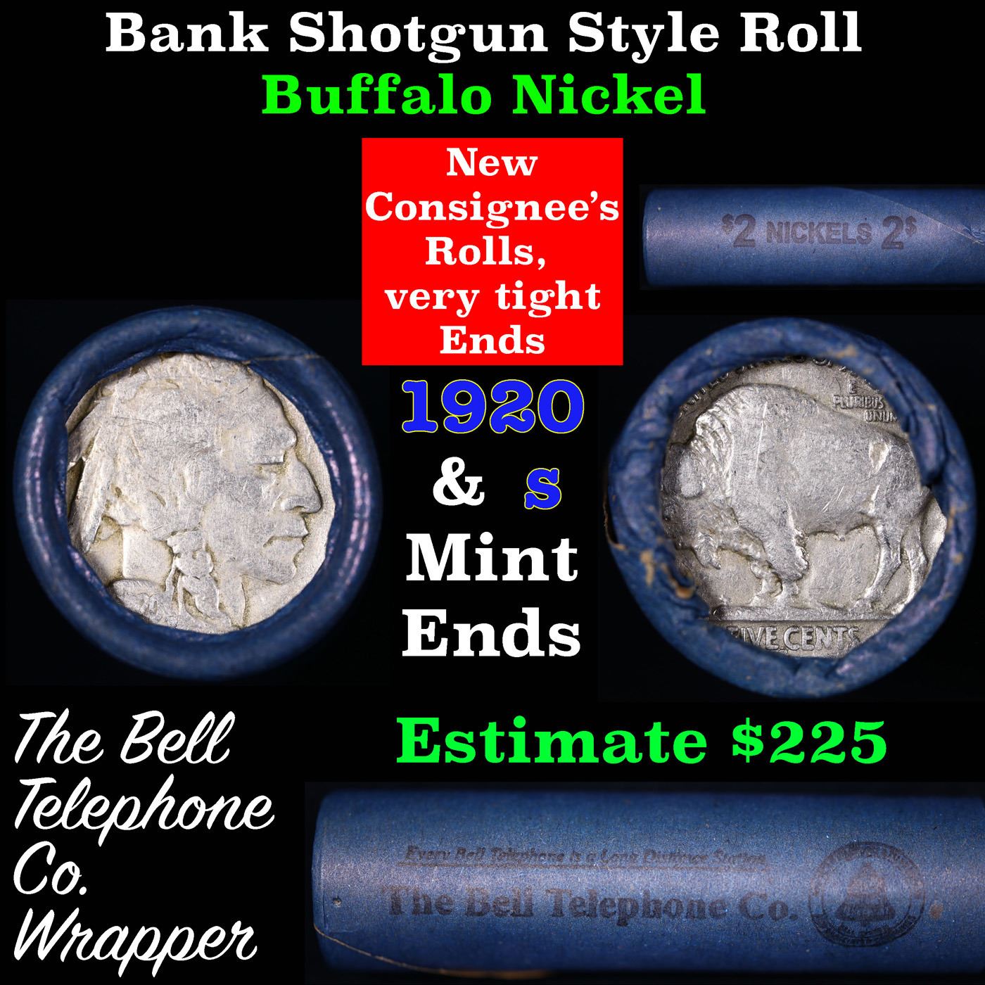 Buffalo Nickel Shotgun Roll in Old Bank Style 'Bell Telephone' Wrapper 1920 & S Mint Ends. The roll is held in an old, rare "Bell Telephone Co." Bank style wrapper. This is the Bell Telephone logo from the 1960's. They are all frrom one Estate. The ends on these rolls are very tight. We will guarantee they are all full dates.