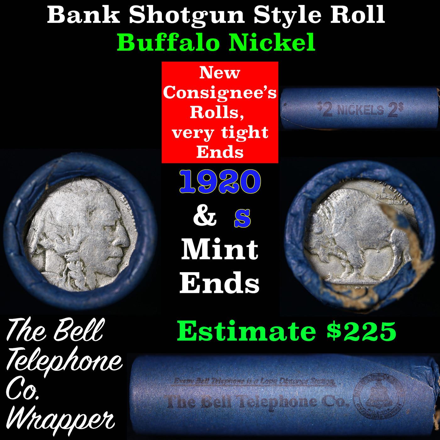 Buffalo Nickel Shotgun Roll in Old Bank Style 'Bell Telephone' Wrapper 1920 & S Mint Ends. The roll is held in an old, rare "Bell Telephone Co." Bank style wrapper. This is the Bell Telephone logo from the 1960's. They are all frrom one Estate. The ends on these rolls are very tight. We will guarantee they are all full dates.