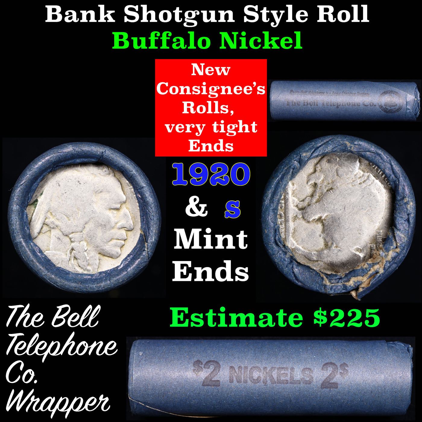 Buffalo Nickel Shotgun Roll in Old Bank Style 'Bell Telephone' Wrapper 1920 & S Mint Ends. The roll is held in an old, rare "Bell Telephone Co." Bank style wrapper. This is the Bell Telephone logo from the 1960's. They are all frrom one Estate. The ends on these rolls are very tight. We will guarantee they are all full dates.
