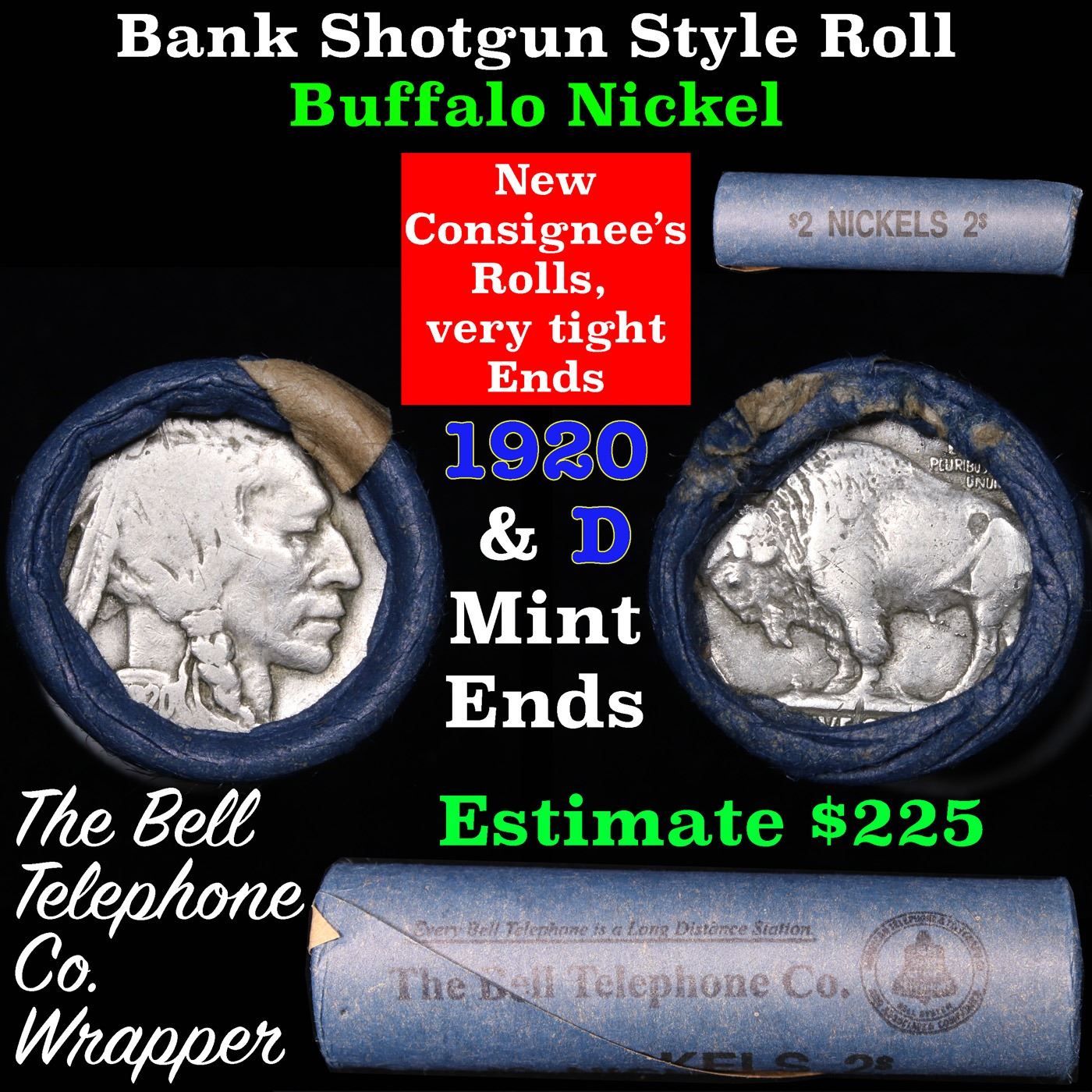 Buffalo Nickel Shotgun Roll in Old Bank Style 'Bell Telephone' Wrapper 1920 & d Mint Ends Grades. The roll is held in an old, rare "Bell Telephone Co." Bank style wrapper. This is the Bell Telephone logo from the 1960's. They are all frrom one Estate. The ends on these rolls are very tight. We will guarantee they are all full dates.