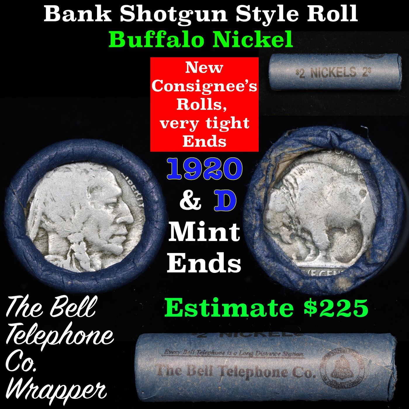 Buffalo Nickel Shotgun Roll in Old Bank Style 'Bell Telephone' Wrapper 1920 & d Mint Ends Grades. The roll is held in an old, rare "Bell Telephone Co." Bank style wrapper. This is the Bell Telephone logo from the 1960's. They are all frrom one Estate. The ends on these rolls are very tight. We will guarantee they are all full dates.