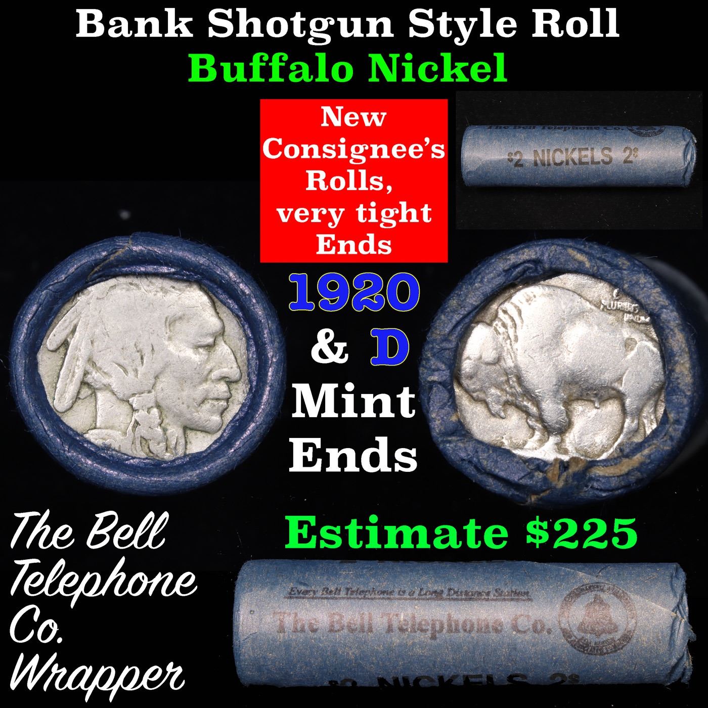 Buffalo Nickel Shotgun Roll in Old Bank Style 'Bell Telephone' Wrapper 1920 & d Mint Ends Grades. The roll is held in an old, rare "Bell Telephone Co." Bank style wrapper. This is the Bell Telephone logo from the 1960's. They are all frrom one Estate. The ends on these rolls are very tight. We will guarantee they are all full dates.