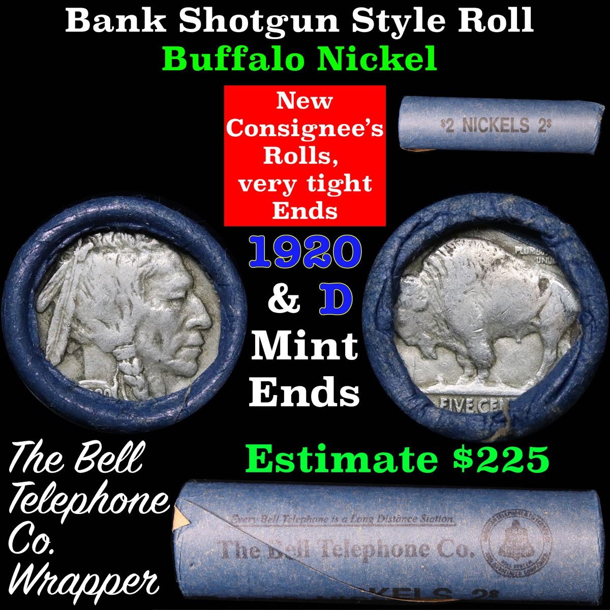 Buffalo Nickel Shotgun Roll in Old Bank Style 'Bell Telephone' Wrapper 1920 & d Mint Ends . .. The roll is held in an old, rare "Bell Telephone Co." Bank style wrapper. This is the Bell Telephone logo from the 1960's. They are all frrom one Estate. The ends on these rolls are very tight. We will guarantee they are all full dates.