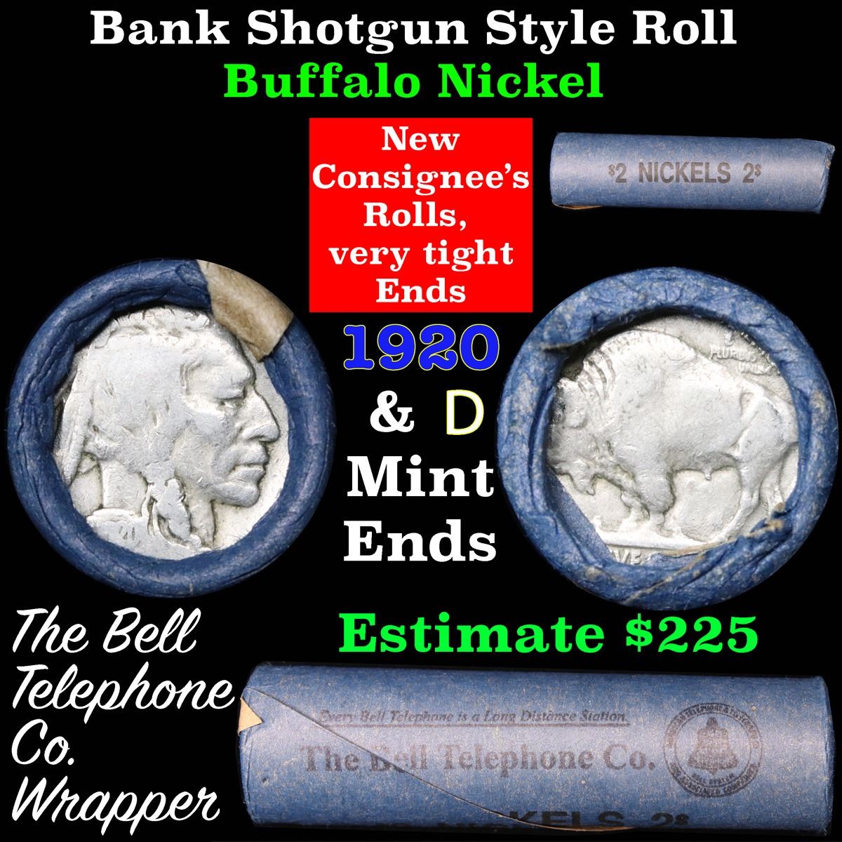 Buffalo Nickel Shotgun Roll in Old Bank Style 'Bell Telephone' Wrapper 1920 & d Mint Ends . .. The roll is held in an old, rare "Bell Telephone Co." Bank style wrapper. This is the Bell Telephone logo from the 1960's. They are all frrom one Estate. The ends on these rolls are very tight. We will guarantee they are all full dates.
