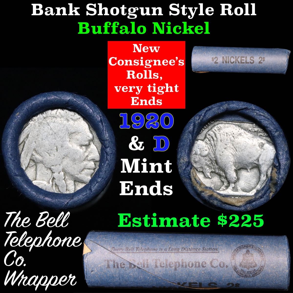 Buffalo Nickel Shotgun Roll in Old Bank Style 'Bell Telephone' Wrapper 1920 & d Mint Ends . .. The roll is held in an old, rare "Bell Telephone Co." Bank style wrapper. This is the Bell Telephone logo from the 1960's. They are all frrom one Estate. The ends on these rolls are very tight. We will guarantee they are all full dates.