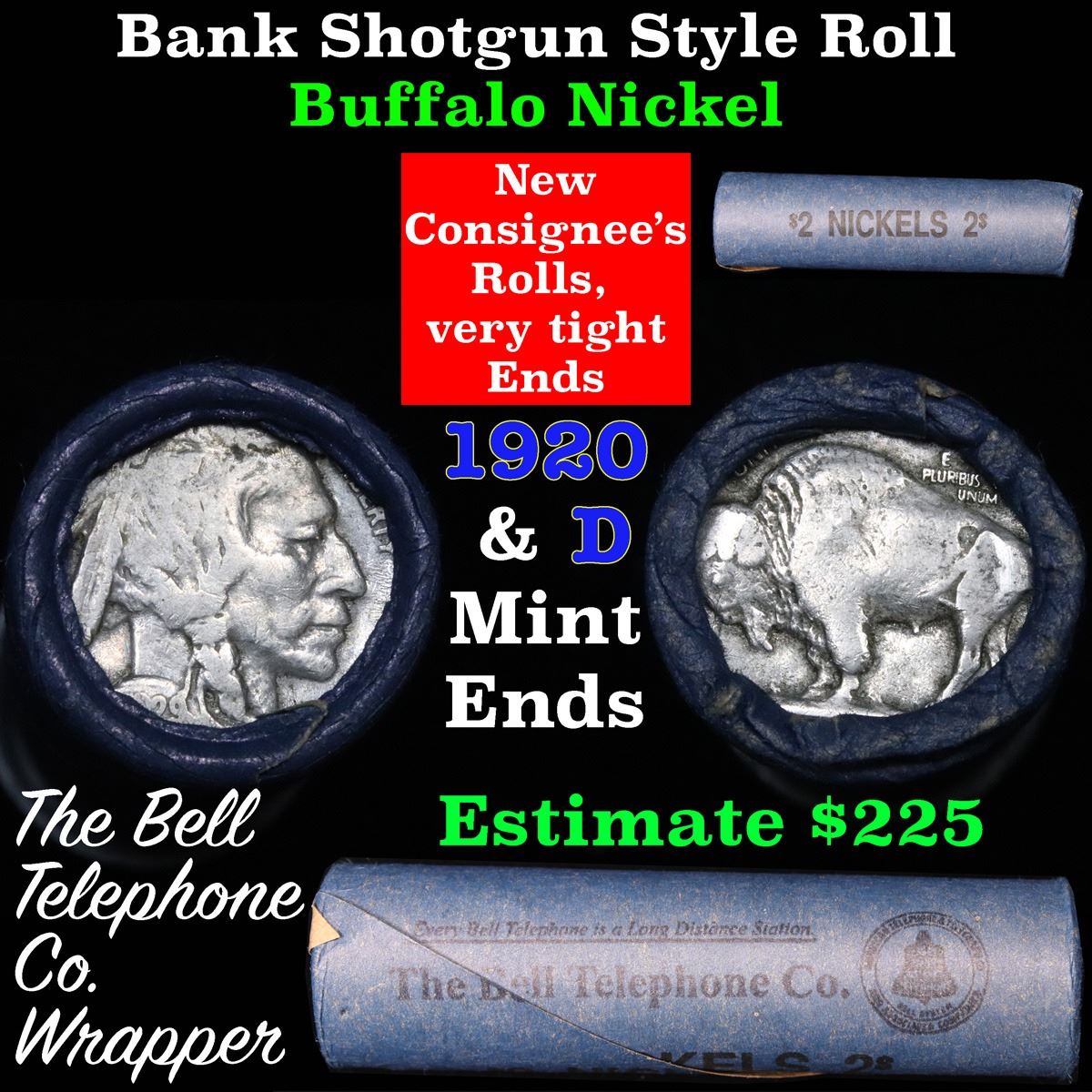 Buffalo Nickel Shotgun Roll in Old Bank Style 'Bell Telephone' Wrapper 1920 & d Mint Ends. The roll is held in an old, rare "Bell Telephone Co." Bank style wrapper. This is the Bell Telephone logo from the 1960's. They are all frrom one Estate. The ends on these rolls are very tight. We will guarantee they are all full dates.
