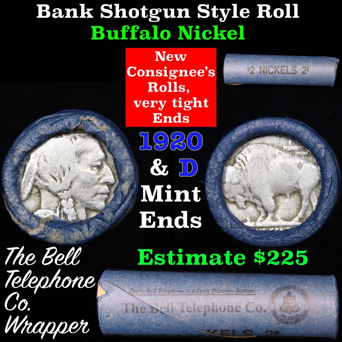 Buffalo Nickel Shotgun Roll in Old Bank Style 'Bell Telephone' Wrapper 1920 & d Mint Ends. The roll is held in an old, rare "Bell Telephone Co." Bank style wrapper. This is the Bell Telephone logo from the 1960's. They are all frrom one Estate. The ends on these rolls are very tight. We will guarantee they are all full dates.